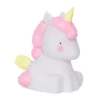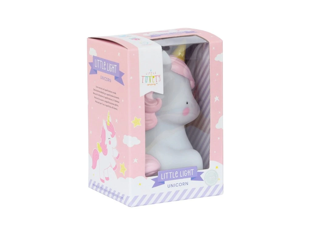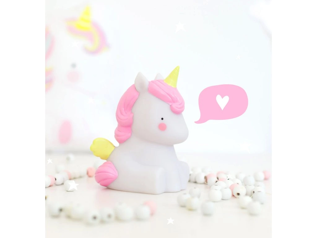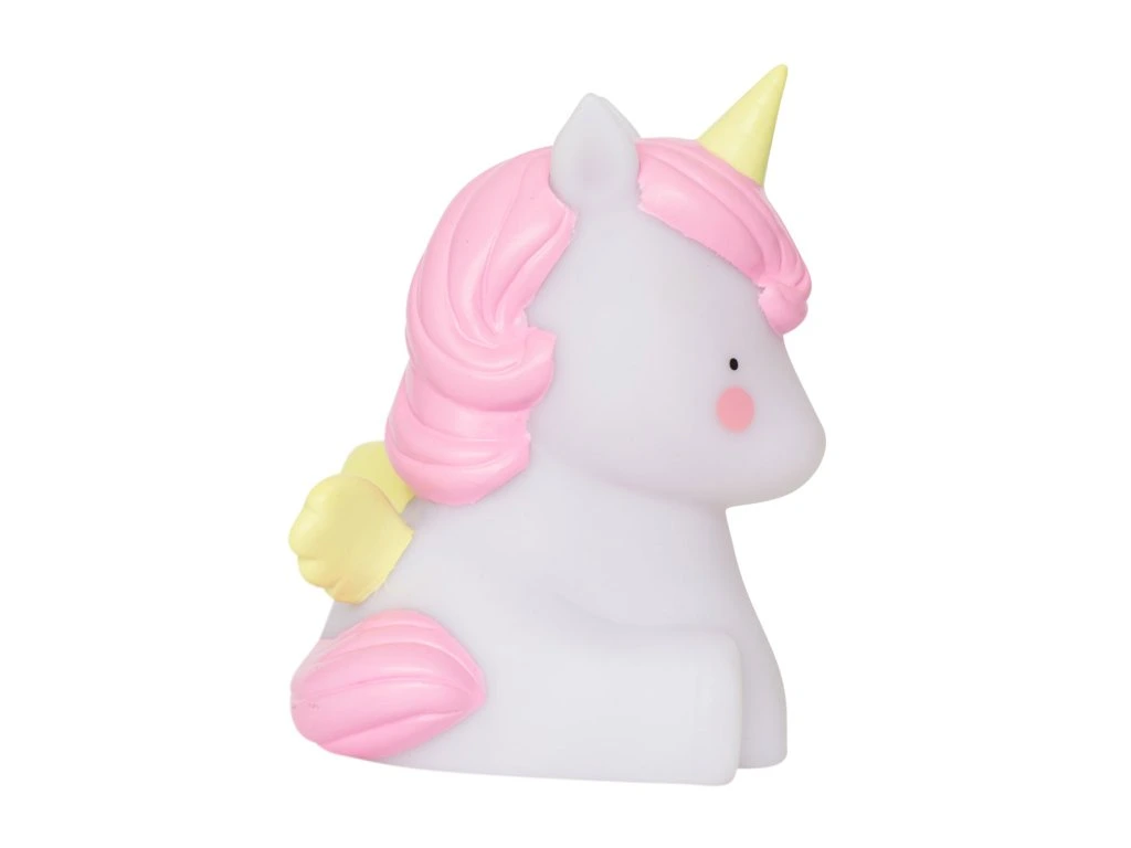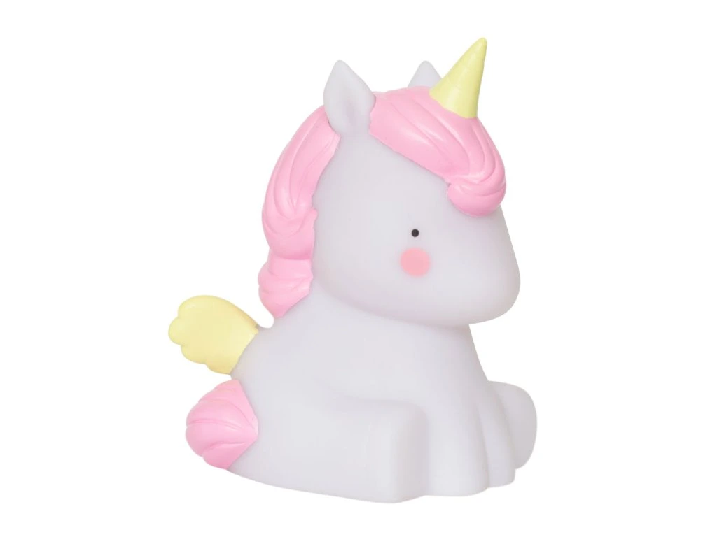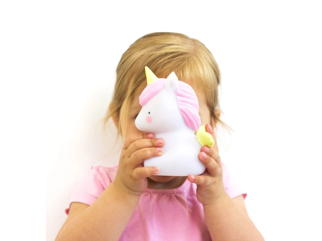 Malé noční světlo A Little Lovely Company v podobě jednorožce svítí jemnou září a pomáhá dětem v klidu usnout. Díky LED se nezahřívá a je z bezpečného PVC bez BPA, ftalátů a olova. Má tři režimy včetně časovače na 15 minut, který šetří baterie. Běží na 3× LR44 (součástí balení) a vydrží přibližně 20 hodin. Kompaktní rozměry 8,5 × 12,5 × 10 cm z něj dělají ideální světlo na noční stolek i na cesty.