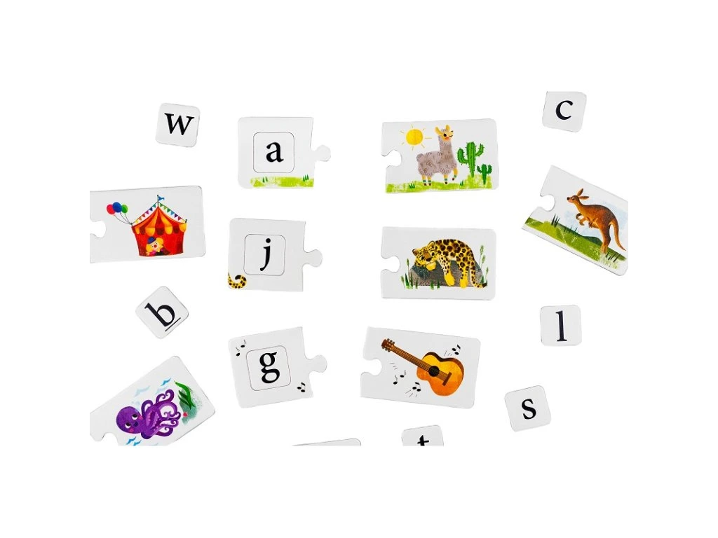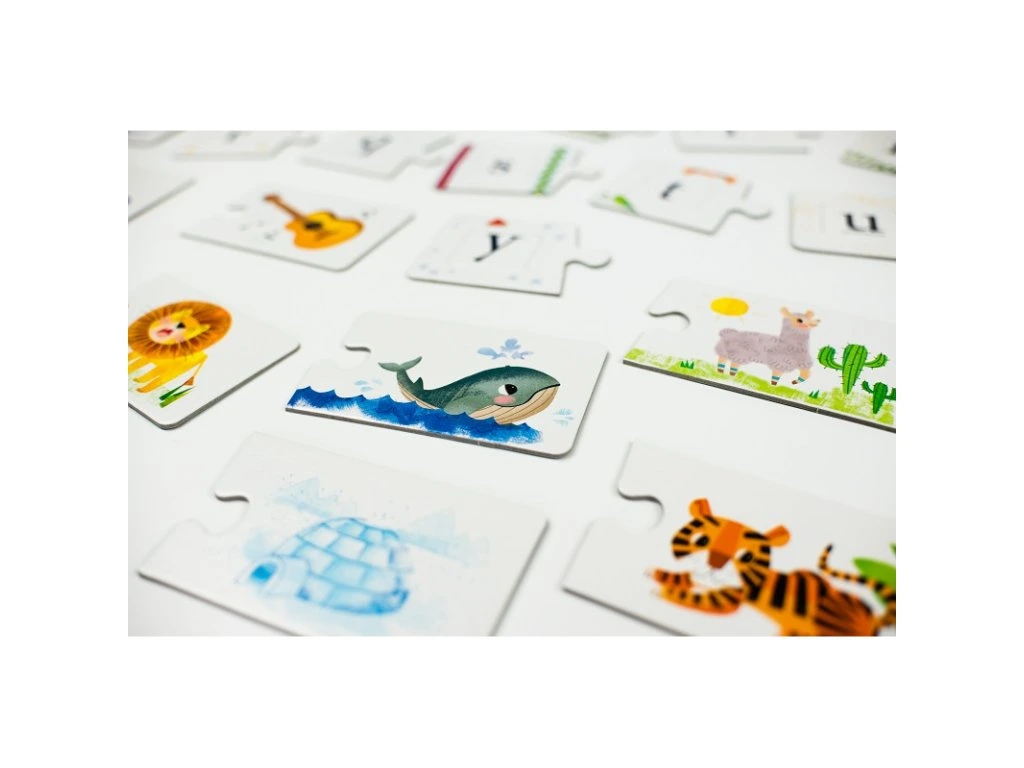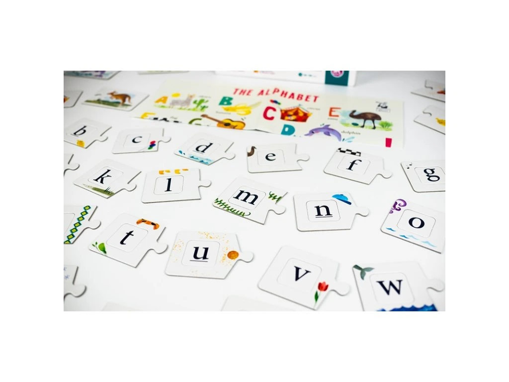 26 dvoudílných dílků skládačky s vyjímatelnými žetony s písmeny, 12 žetonů s dalšími písmeny, 1 barevný plakát s anglickou abecedou.