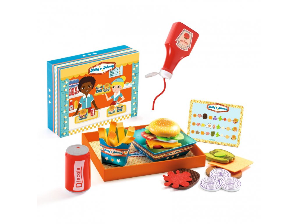 Box slouží současně jako prostor pro přípravu hamburgerů a najdete v něm spoustu plstěných přísad, ze kterých hamburger děti sestaví.