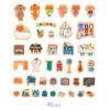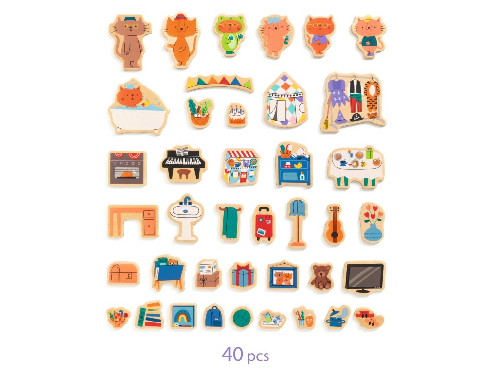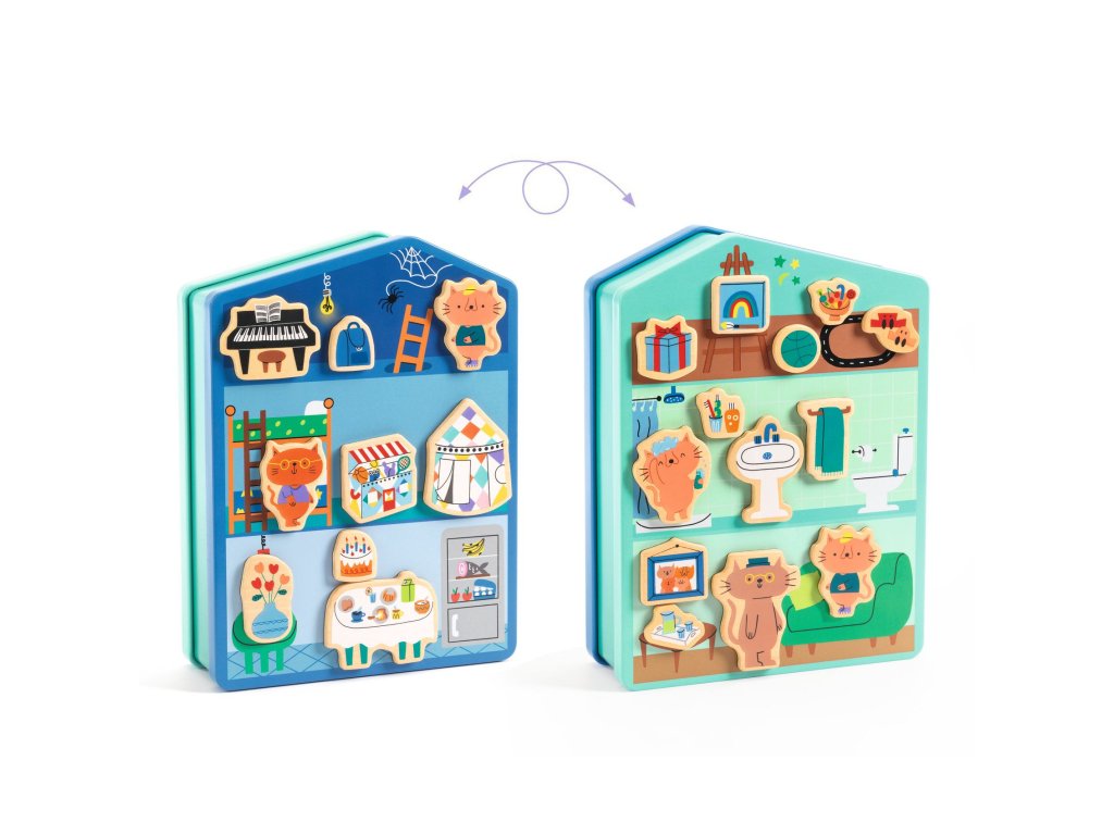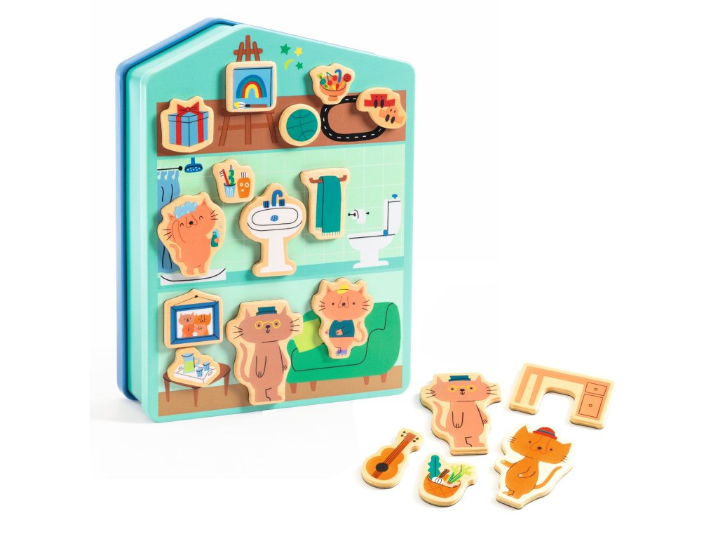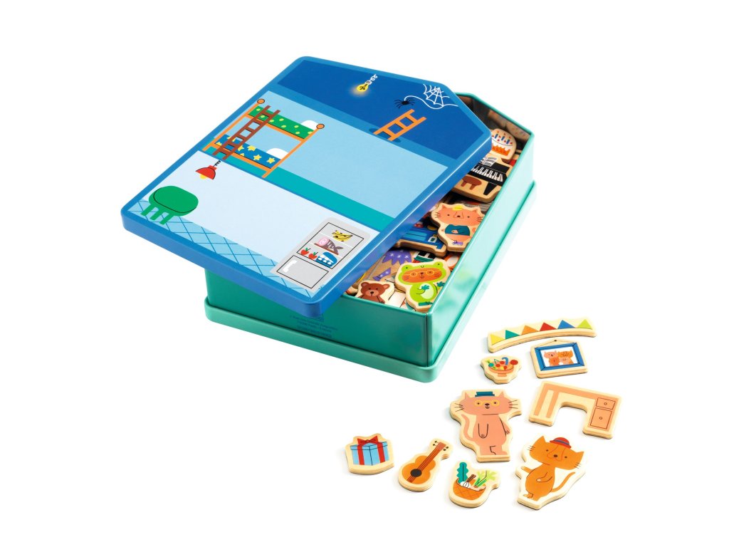 Kovová krabička ve tvaru domečku, která je zároveň herní scénou – a uvnitř spousta dřevěných magnetů k vyzdobení každé místnosti. Děti mohou libovolně přestavovat 6 pokojů (podkroví, ložnice, kuchyně, obývák, koupelna a herna), vyprávět příběhy a rozvíjet fantazii i jemnou motoriku. Po hře všechno zase zavřete do domečku a můžete vyrazit. Skvělé „tiché“ hraní na doma i na cesty.