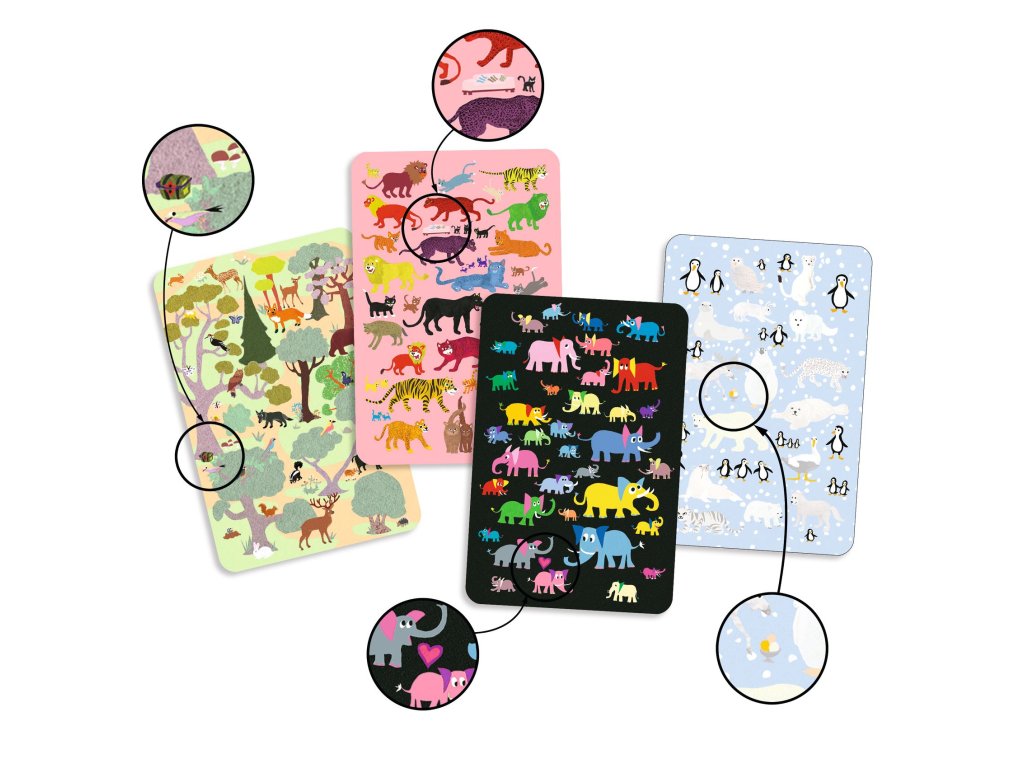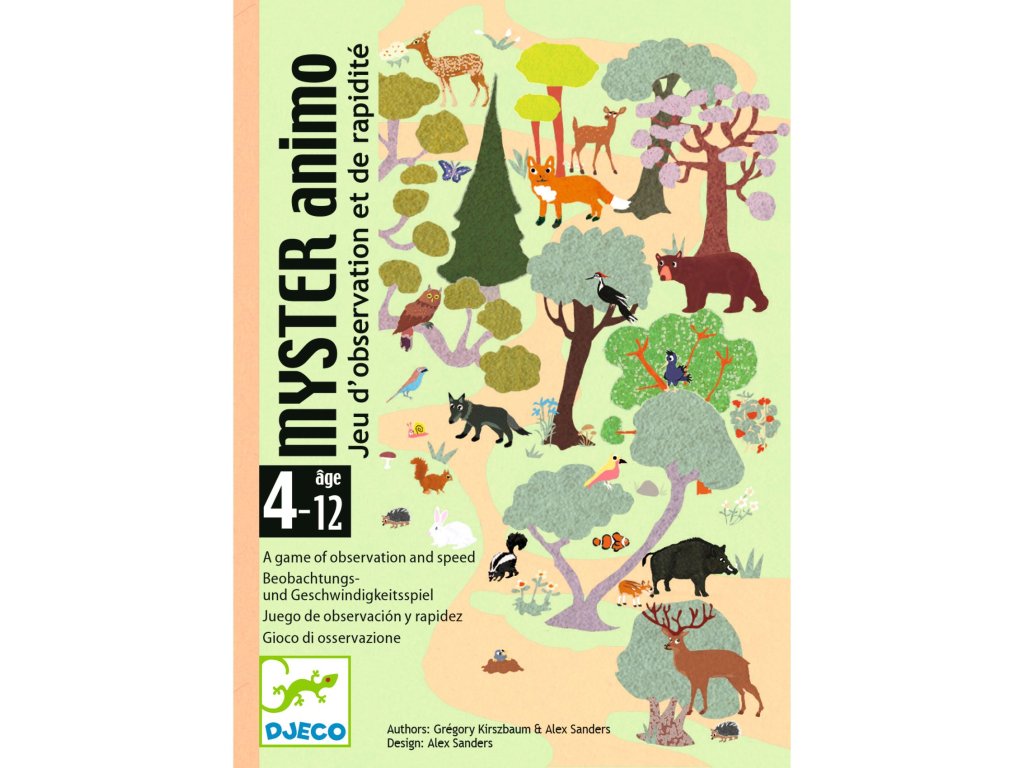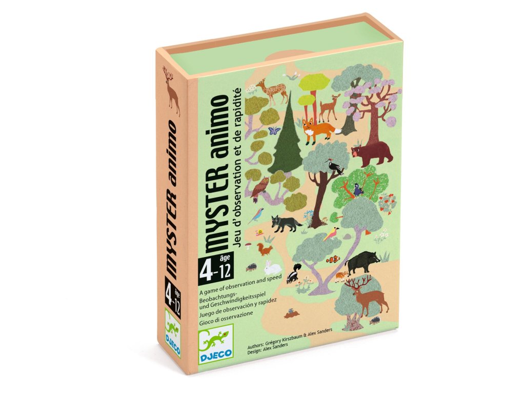 Rychlá a napínavá hra na pozorování pro bystré děti. DJECO Myster Animo je svižná karetní hra vhodná pro děti od 4 let, která trénuje postřeh, soustředění a pohotovost. Cílem hry je co nejrychleji nalézt na každé kartě nenápadného vetřelce – zvířátko či předmět, který do obrázku očividně nezapadá