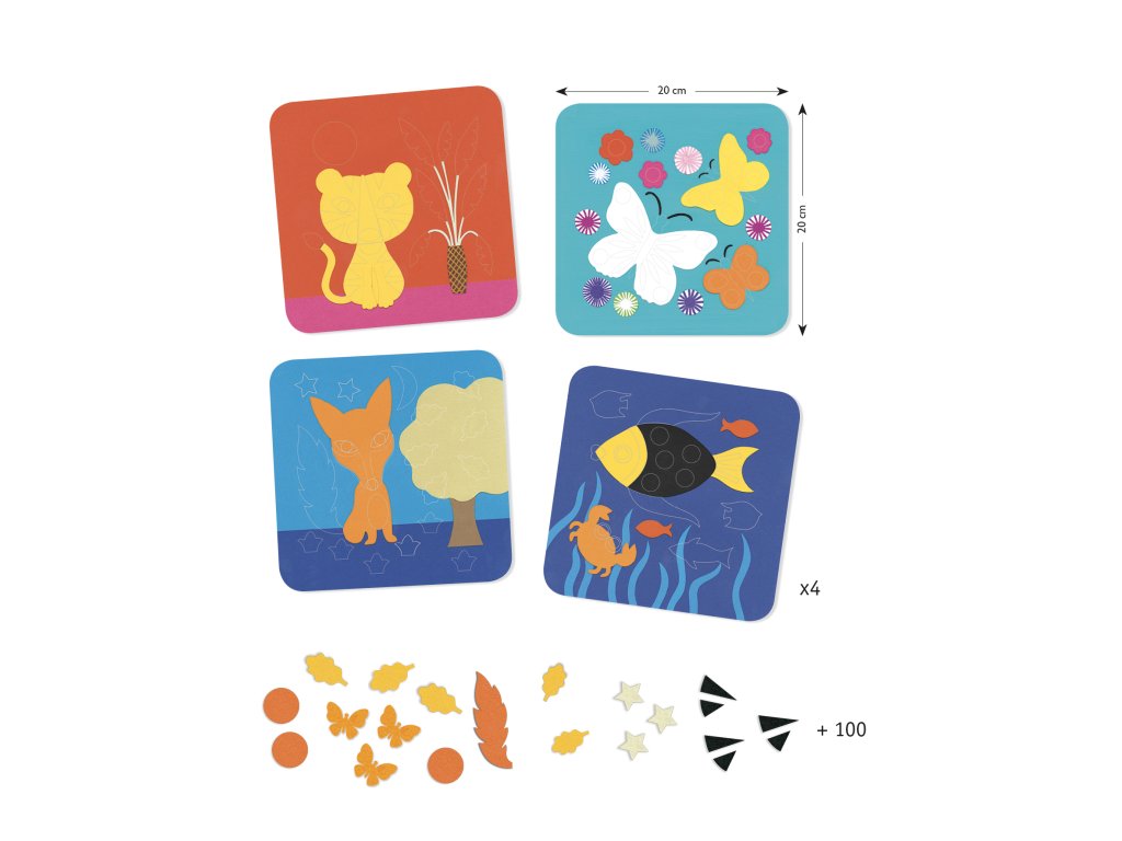 • Obsah balení: 4 šablony (cca 20 × 20 cm), 114 plstěných samolepek, kroková brožurka.