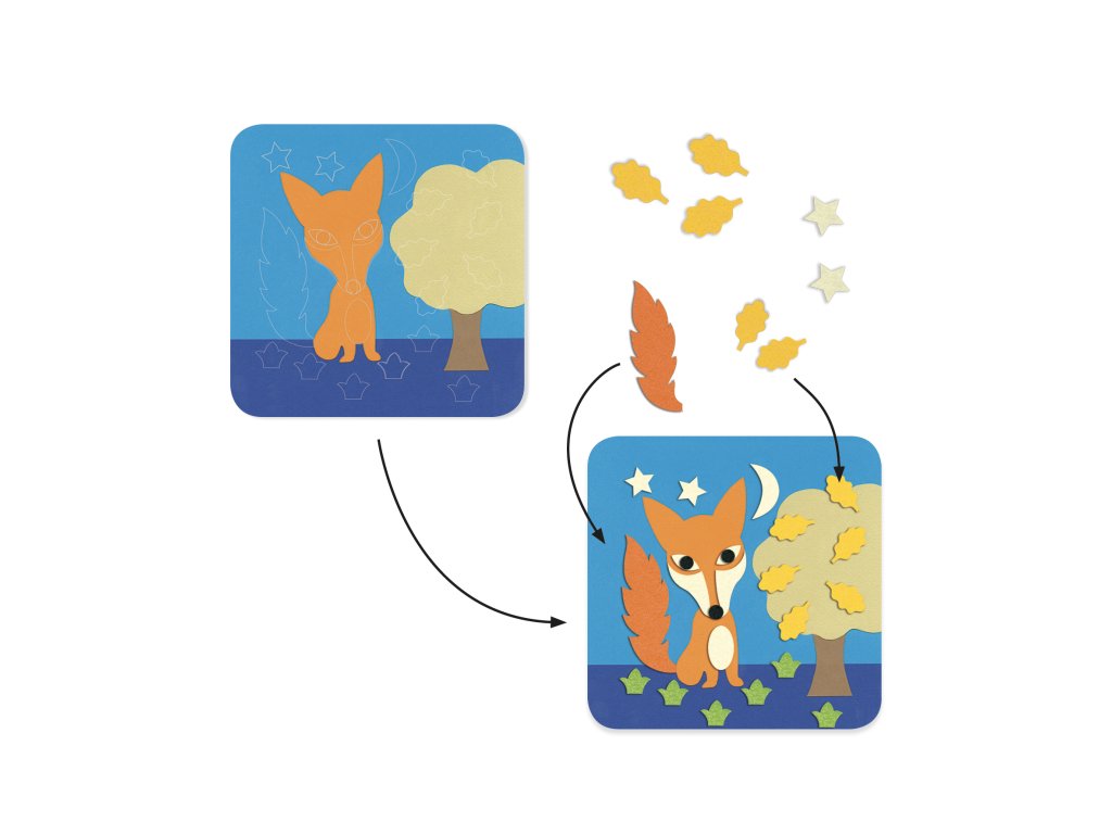 Dítě si vybere jednu ze 4 šablon (cca 20 × 20 cm), bere plstěné samolepky a doplňuje obrázek – buď podle návodu, nebo čistě podle fantazie. Hotové obrázky díky plsti působí plasticky a jsou příjemné na dotek.
