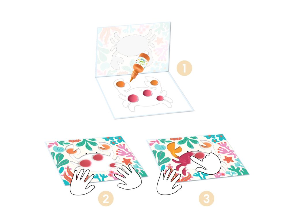 Vyberte ilustrovanou kapsu, odlepte uzávěr, kápněte pár kapek barvy, kapsu uzavřete a nechte dítě prstíky mačkat a rozmazávat barvu po obrázku. Po dokončení kapsu otevřete a opláchnete mýdlem a vodou. Stejnou kapsu použijete znovu – pokaždé vznikne jiný mořský svět.