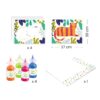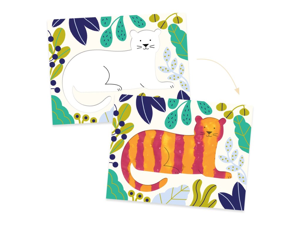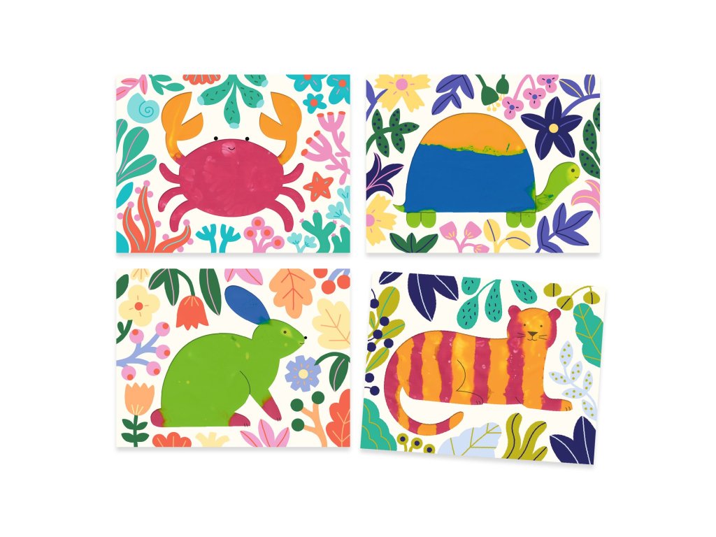 - Obsah balení: 4 omyvatelné plastové kapsy s ilustracemi, 4 lahvičky barev (červená, oranžová, modrá, zelená), obrázkový návod.