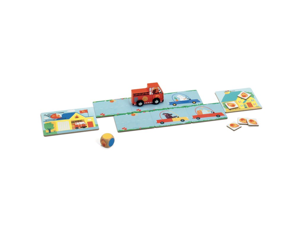 Hráč hodí kostkou. Podle výsledku odkryje kartu cesty (zkontroluje, zda je volno) nebo popojede hasičským autem. Oheň mezitím „roste“ – pokud dorazíte k domu dřív, vyhrál celý tým. Když dojdou žetony ohně, dům se nepodařilo zachránit a hráči prohrávají společně. Jednoduché, napínavé, znovuhratelné.