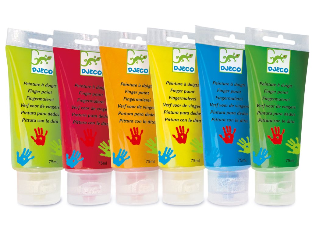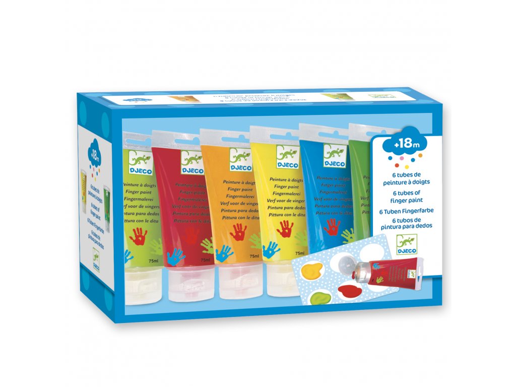 - Obsah balení: 6 tub s prstovými barvami (6×75 ml) + plastová omyvatelná paleta.