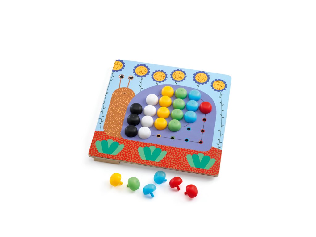 Barevné kolíčky, zvířátkové předlohy a spousta radosti z tvoření. Děti vkládají velké barevné kolíčky do otvorů v obrázku položeném na dřevěné desce – podle barev, nebo úplně podle sebe. Skvěle to trénuje jemnou motoriku, úchop a rozpoznávání barev, a přitom vznikají krásné obrázky (šnek, ptáček, včelka, beruška aj.). Ideální první mozaika od 3 let.