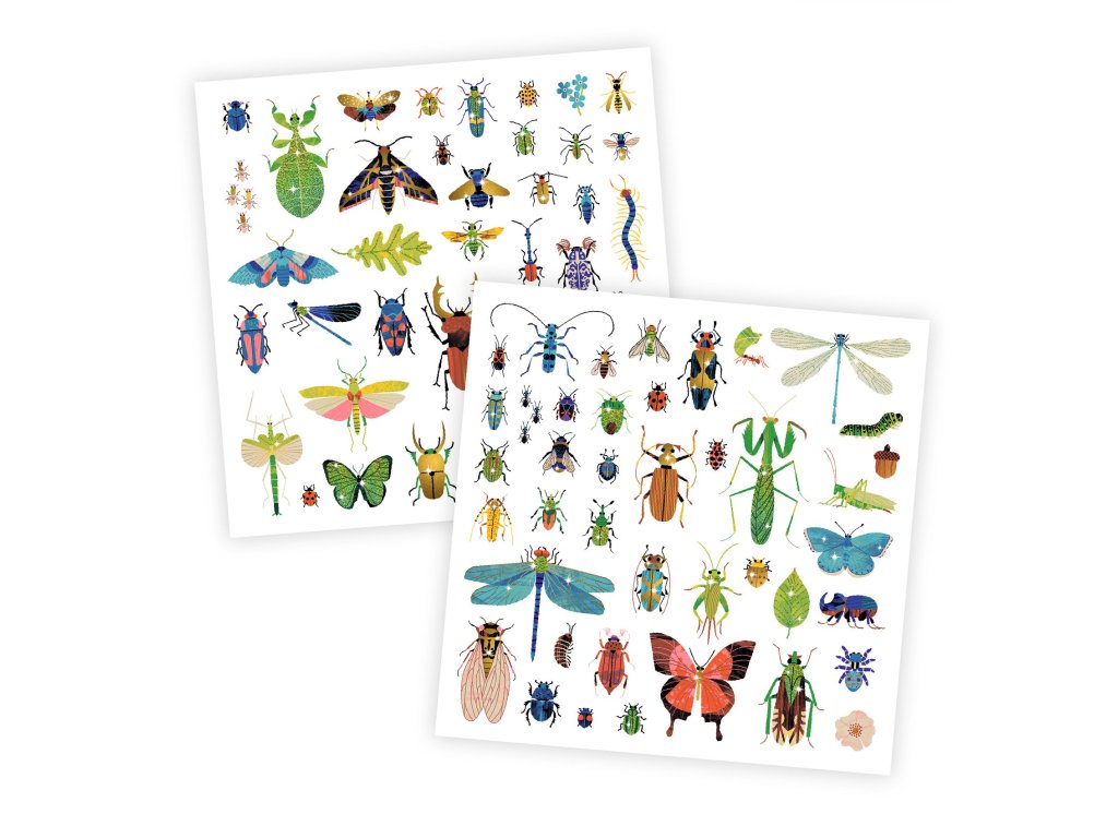 160 třpytivých samolepek, které malého tvůrce přenesou do fascinujícího světa hmyzu a malých živočichů. Motýli, kobylky, vážky, brouci, mravenci… každý detail je vytvořený s jemným leskem, který odráží světlo a dodává výtvorům neobyčejný lesk.