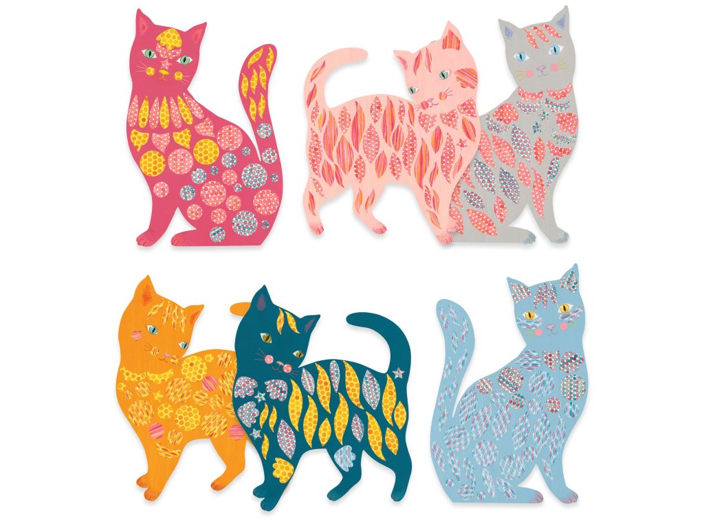 - Obsah balení: 8 siluet koček z pevného kartonu, 8 archů samolepek, 1 brožurka krok za krokem.