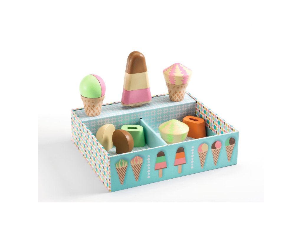 Stylová sada Lina & Lino zve děti do kouzelného světa zmrzlin, kde si mohou hrát na zmrzlináře i zákazníky, objednávat, kombinovat a servírovat nejrůznější sladké dobroty. Stačí vybrat příchuť – citronovo-čokoládovou, jahodovo-vanilkovou nebo třeba třípatrový nanuk – a pustit se do přípravy. Pevná dřevěná krabička slouží nejen k přehlednému uložení všech doplňků, ale po otočení se promění v malý zmrzlinový stánek. Díky barevným dřevěným kouskům si děti užijí realistickou hru plnou fantazie a radosti z tvoření.