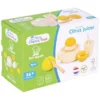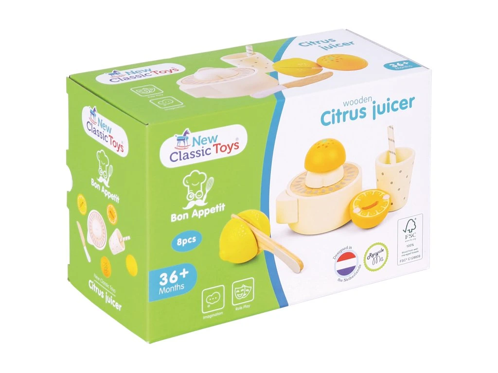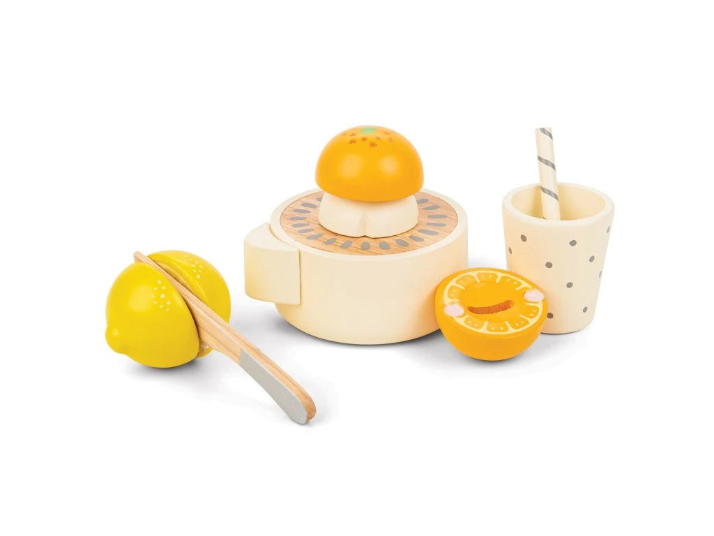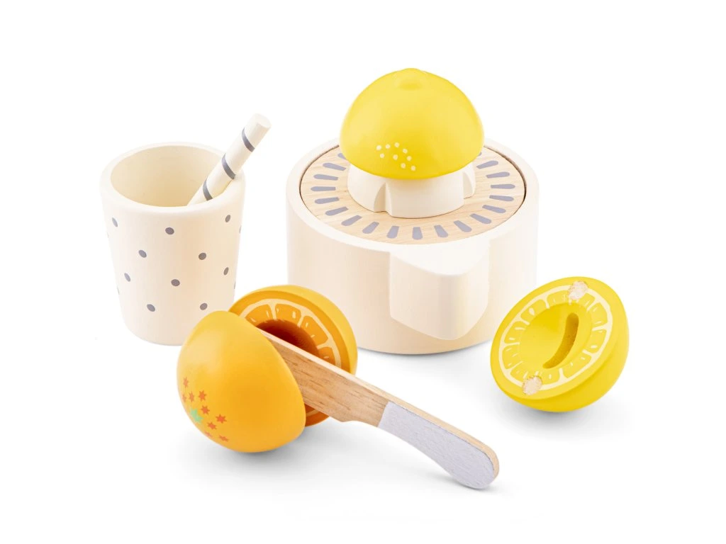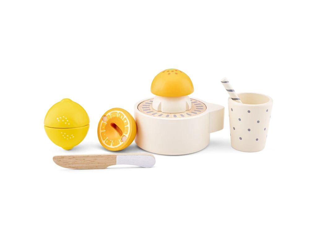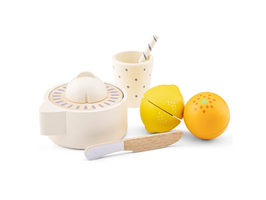 Dřevěný lis na citrusy je dokonalým doplňkem každé dětské kuchyňky pro děti od 3 let a přináší do hry nejen zábavu, ale i prostor pro učení a rozvoj dovedností. Sada obsahuje realistický pomeranč a citron, rozdělené na poloviny pomocí suchého zipu, které děti mohou snadno rozkrojit přiloženým dřevěným nožem. Děti si procvičí jemnou motoriku, když ovoce rozdělují a následně lisují na odšťavňovači. Stačí zatlačit nebo otočit, a dítě si bude připadat jako ve skutečné kuchyni. Při otáčení ovoce na odšťavňovači můžete slyšet jemné cvaknutí. Hotový nápoj lze naservírovat v kelímku s brčkem.