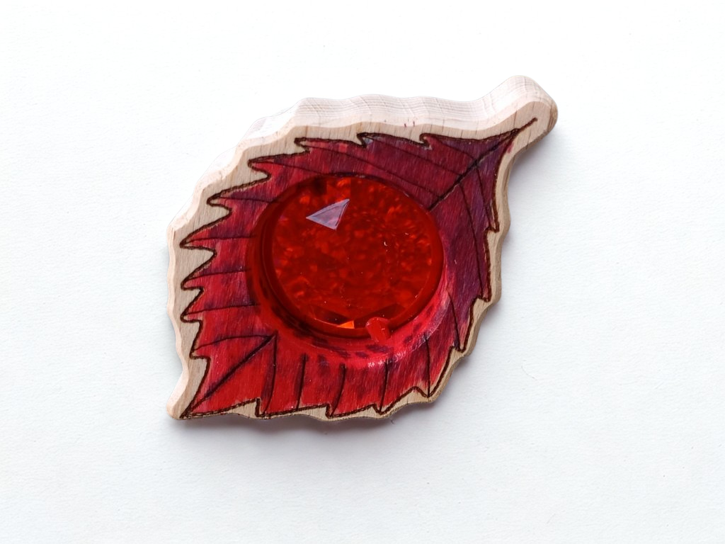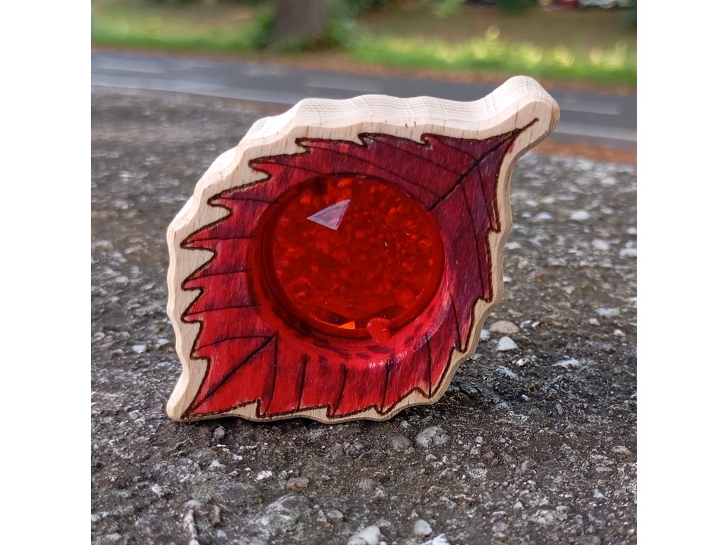 Energií nabitý kousek pro kreativní objevitele. Červené „okénko“ třešňového listu podněcuje zkoušení kontrastů, hledání červených objektů a míchání nových odstínů se světlem. Organický tvar podporuje smyslové vnímání a slovní zásobu (barvy, tvary, ovoce, stromy). Odolné dřevěné tělo je bezpečné a dobře se drží. Výtečný společník pro hru na světelném panelu i na parapetu.