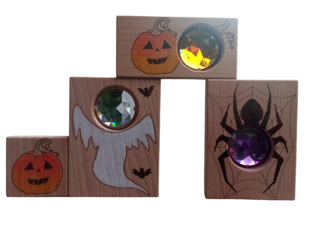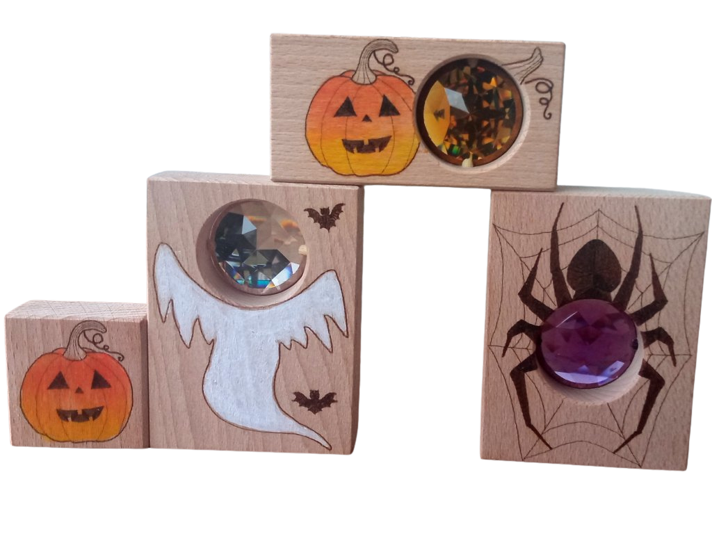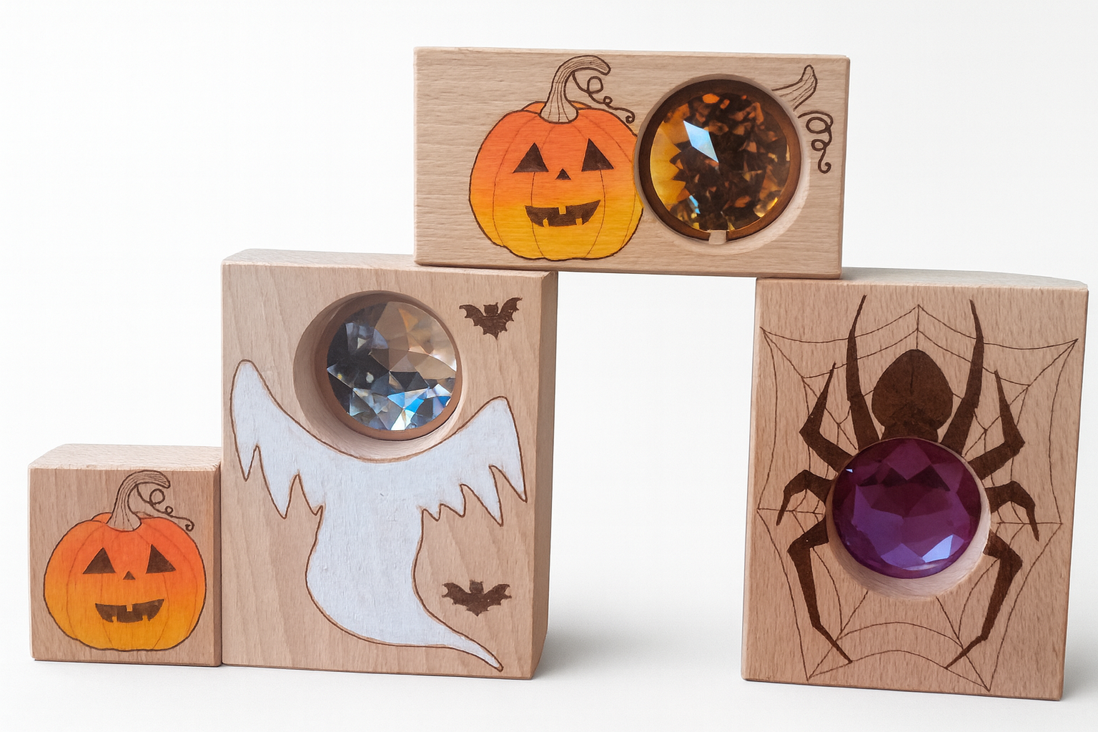 K podzimu patří světýlka, stíny a trocha „bububu“ – přesně to tahle limitovaná Halloween sada přináší do dětské hry i sezónní výzdoby. V balení najdeš tři kuk-kostky se sklíčky pro hru se světlem a jednu malovanou kostku navíc. Motivy? Fialový pavouček, zlatá dýně a bílý duch – zábavná trojka na tvoření miniscén, světelných pokusů a podzimních koutků. Kostky rozvíjejí otevřenou hru, smyslové vnímání, třídění a slovní zásobu (barvy, tvary, sezónní témata). Autorská práce z kvalitního dřeva zaručí příjemný dotyk i dlouhou životnost.