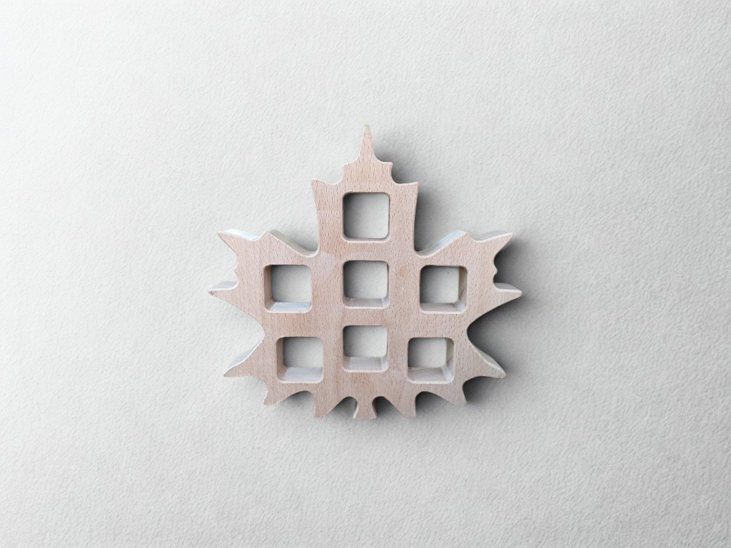 - Dřevěný javorový list (buk) bez kostek – kompatibilní s epoxidovými kostkami o hraně 25 mm (až 7 pozic).