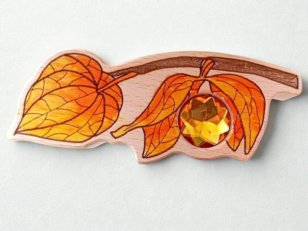 Podzim v dlaních: drobná dřevěná mochyně (čínský lampionek) rozzáří sezónní poličku i dětské miniscény. Díky průhlednému „sklíčku“ se krásně hodí k prostupování světla – u okna, se světýlky nebo baterkou. Děti ji rády berou do hry jako rekvizitu k třídění podzimních pokladů (šišky, šípky, listy) a k objevování barev. Minimalistický autorský motiv ladí s dalšími podzimními kousky značky Dřevo z duhy a funguje i jako milý dárek.