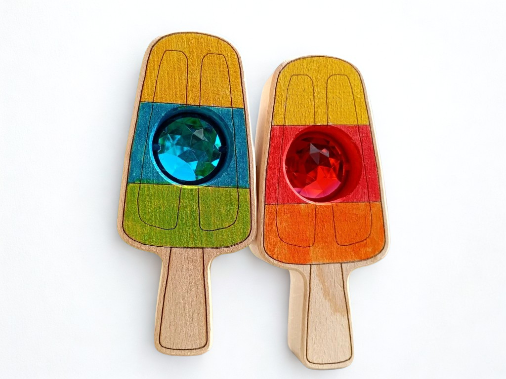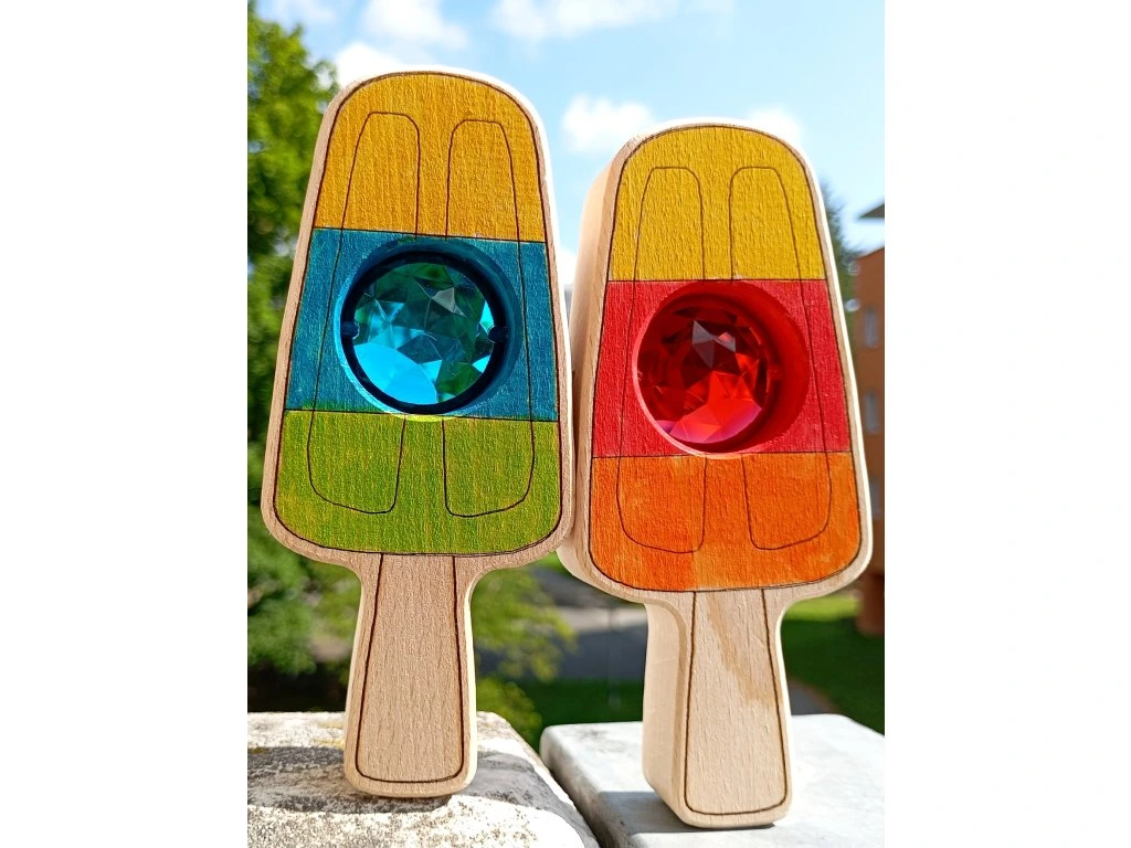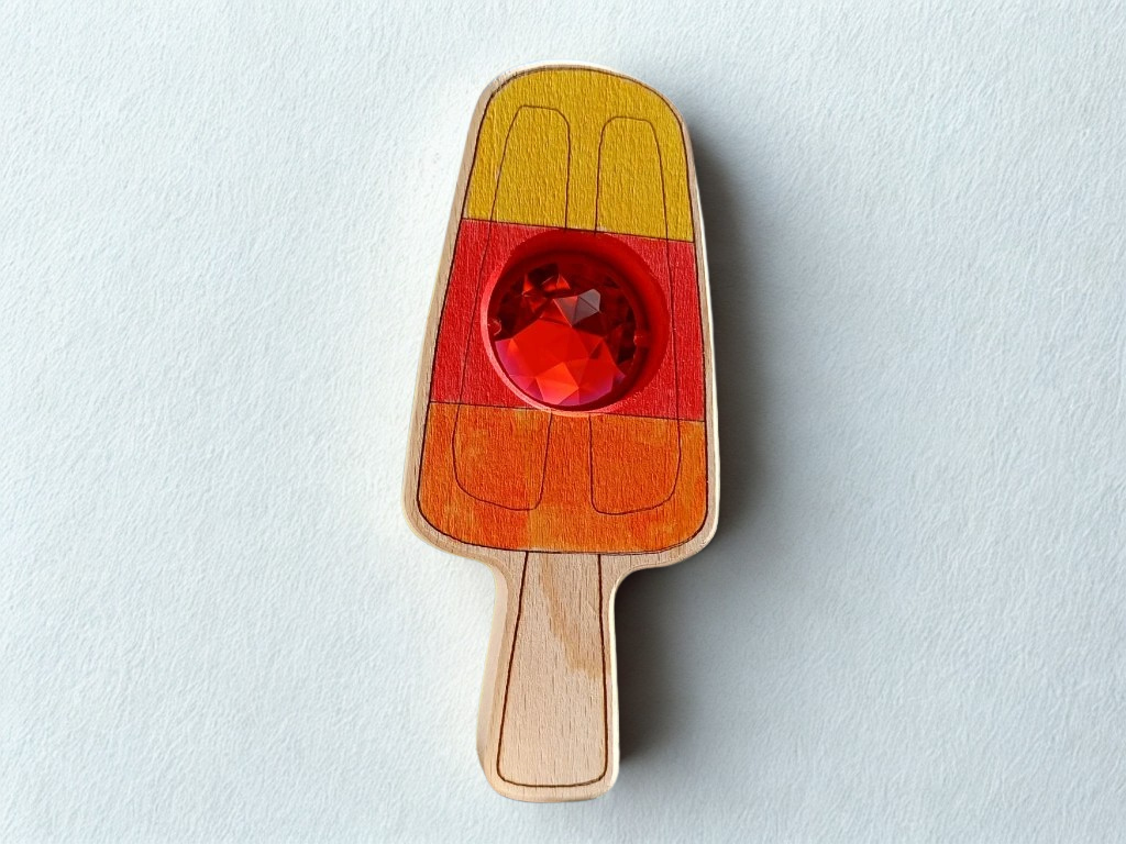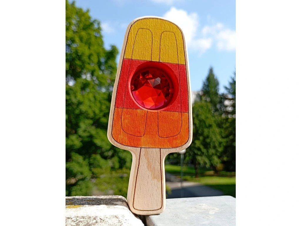 Tato dřevěná kostka ve tvaru nanuku je osvěžujícím kouskem pro smyslovou hru i dekoraci. Průhledné červené sklíčko vytváří nádherný světelný efekt, když skrze něj prosvítá slunce nebo interiérové světlo. Kostka je inspirovaná hračkami waldorfské tradice a podporuje open-ended hraní, kde dětská fantazie není omezena.