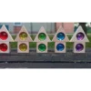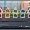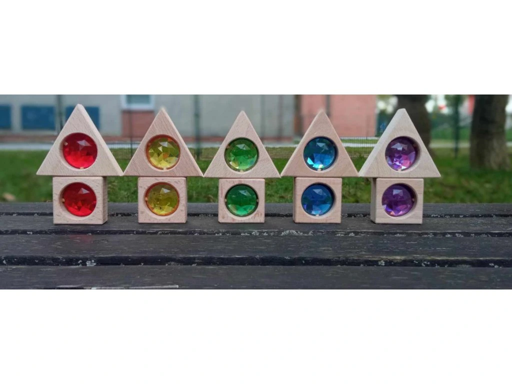 Sada obsahuje 5 dřevěných čtvercových a 5 trojúhelníkových kuk-kostek v duhových barvách, které fungují jako kaleidoskop. Rozměry čtvercových kostek jsou 4×4×2 cm, trojúhelníkové mají stranu 6,9 cm a hloubku 2 cm. Sklíčka o průměru 3 cm lákají k průzračným pohledům dětí na svět.