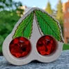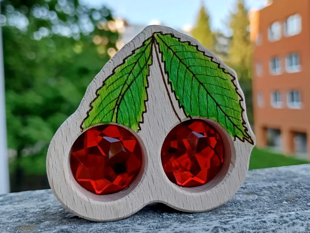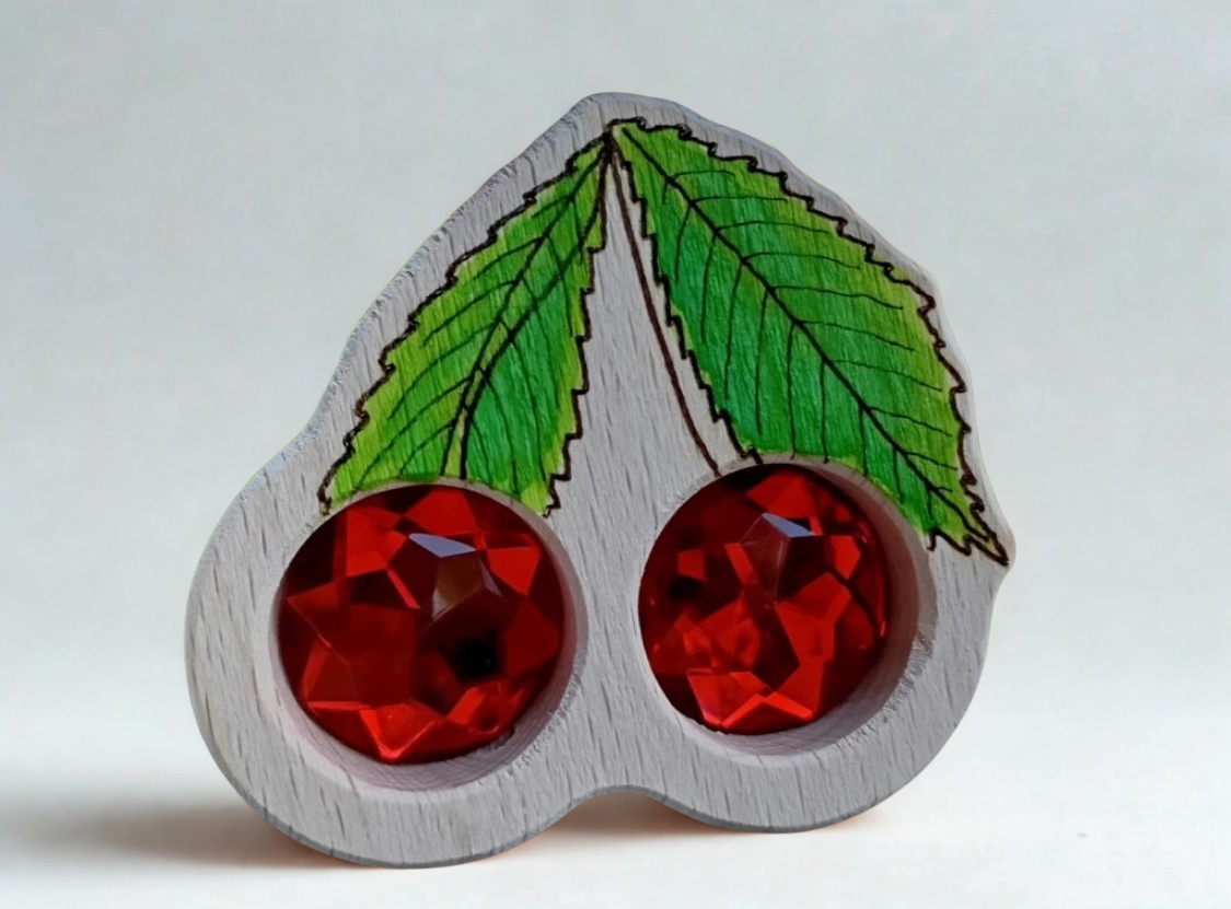 Tato dřevěná kostka ve tvaru třešní je doplněna neprůhledným červeným sklíčkem a dekorována zelenými listy, které obohacují její vizuální půvab. Kombinace zářivé červené a jemné zelené vytvoří silný vizuální a hmatový zážitek, který podněcuje k senzomotorickému objevování. Kostka přirozeně zapadá do typologie open-ended hraček, které vybízejí k neomezené kreativitě a spontánní hře bez pevných pravidel.