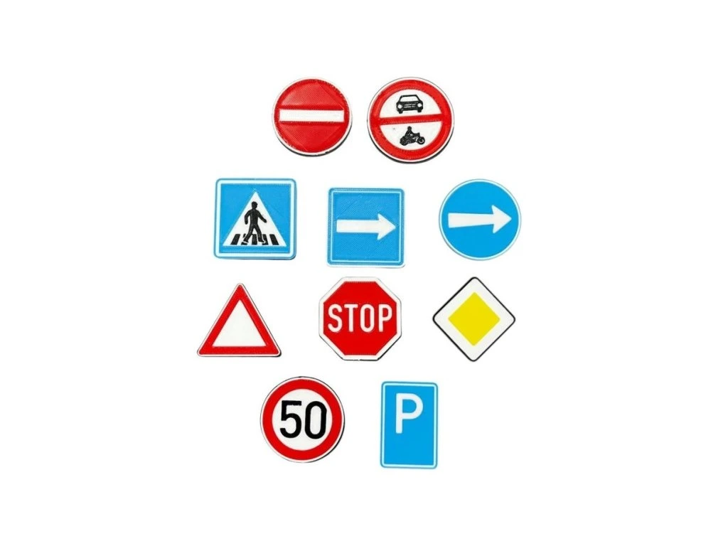 Sada dopravních značek je skvělou edukační pomůckou pro malé děti, která nabízí mini verze nejběžnějších dopravních značek pro hraní i výuku. Balení obsahuje symboly jako Hlavní silnice, Parkování, Jednosměrka, Přikázaný směr, Přechod pro chodce, Dej přednost v jízdě, Zákaz vjezdu motorovým vozidlům, Nejvyšší povolená rychlost, STOP a Zákaz vjezdu všech vozidel, které lze využít při hrách s auty, stavebnicemi nebo na dětském dopravním hřišti.
