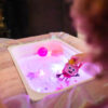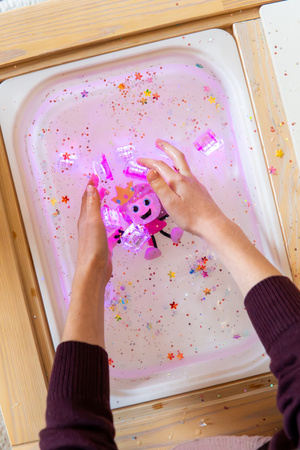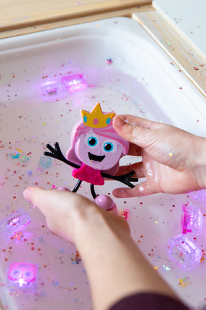 Stačí vložit svítící kostku do zadní části postavičky, ponořit ji do vody – a Ida se rozzáří. Děti mohou pozorovat světlo, hrát si s vodou a zároveň se přirozeně zklidnit. Flexibilní ruce postavičky podporují jemnou motoriku a umožňují snadnou manipulaci i malým dětem.