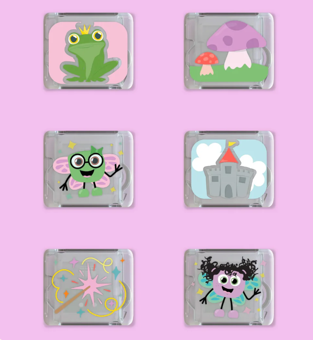Vydejte se na barevné dobrodružství plné světel a pohádkových motivů! Každá kostka v sadě má roztomilou ilustraci spojenou ze světem pohádek – od barevných víl a kouzelného zámku až po žabáka či houby. Je to perfektní volba pro malé milovníky pohádek, kouzel a tvořivé hry.