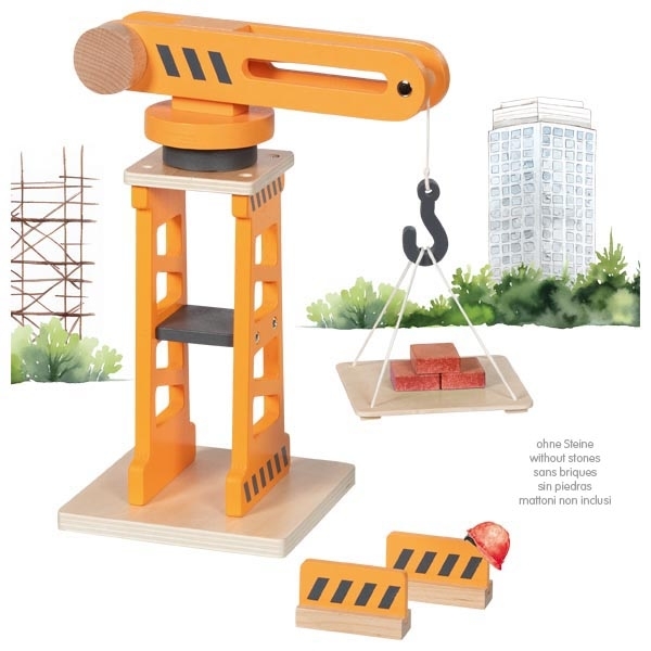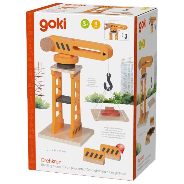 Goki dřevěný otočný jeřáb určený pro děti, které si rády hrají na staveniště a budují vlastní herní světy. Jeřáb lze otočit o 360 °, což umožňuje realistické manipulování s nákladem a doplňky při hře, a dvě bezpečnostní zábrany pomáhají zajistit stabilnější a bezpečnější pohyb břemene. Tento stavební model rozvíjí fantazii, motoriku i kooperativní hru při společném hraní s ostatními.