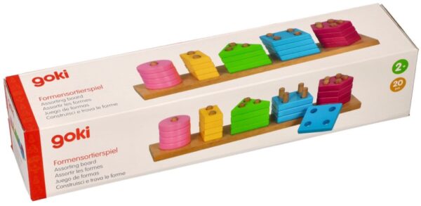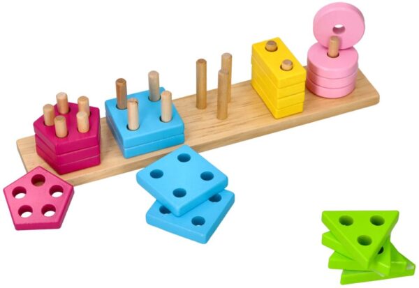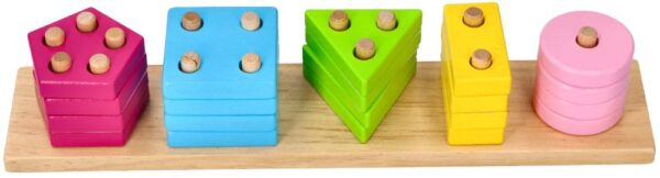 Tato hračka obsahuje 21 dřevěných dílků, které děti třídí podle barev a tvarů. Díky jednoduchému designu a pestrým barvám je hračka atraktivní a snadno pochopitelná i pro nejmenší děti.