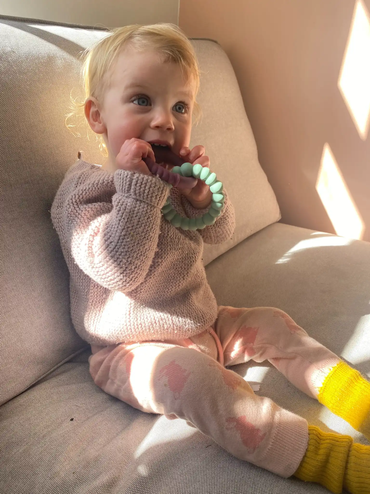 Designové kousátko Slunce přináší úlevu i radost v období prořezávání prvních zoubků. Dva propojené kroužky s odlišnými texturami dávají dětem možnost objevovat různé povrchy – jak pomocí ručiček, tak ústy.