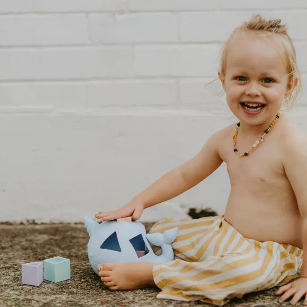Roztomilý narval není jen hračka, ale promyšlená pomůcka pro rozvoj dítěte. Kombinuje třídění tvarů, senzorické hraní a první logické úkoly v jednom. Děti vkládají barevné tvary do otvorů, zkouší, otáčí a hledají správná řešení – přirozeně se tak učí trpělivosti, soustředění i samostatnosti.