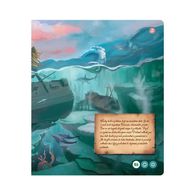 - nabízí napínavý interaktivní příběh o dobrodružné výpravě za pirátským pokladem, která děti zaujme od první stránky