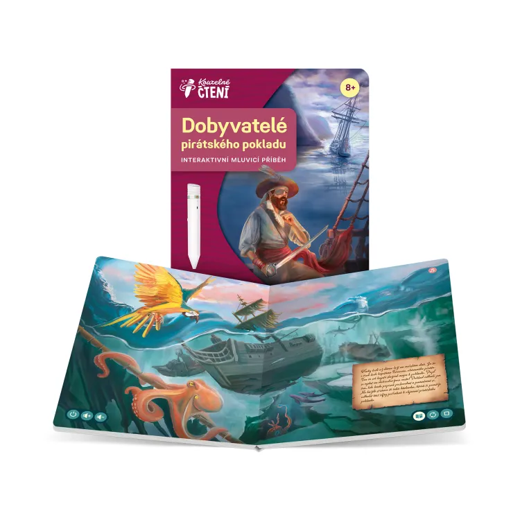 Kniha Dobyvatelé pirátského pokladu z edice Albi Kouzelné čtení je interaktivní mluvící dobrodružná kniha určená dětem od 8 let, která je vtahuje přímo do pirátského příběhu plného hádanek, šifer a objevování pokladu kapitána Farrowa. Na každé stránce na děti čeká logická hádanka nebo úkol, jehož řešení odhalí část šifry potřebné k objevení tajného pokladu – to vyžaduje pozornost, paměť i dedukční schopnosti. Kniha totiž není jen pasivním vyprávěním, ale zapojuje čtenáře jako aktivní účastníky výpravy. Dotykem Albi elektronické tužky se spustí více než 400 zvukových stop obsahujících texty, dialogy, efekty i průvodní informace, které příběh ještě více oživují a podporují imerzivní zážitek z čtení a řešení úkolů.