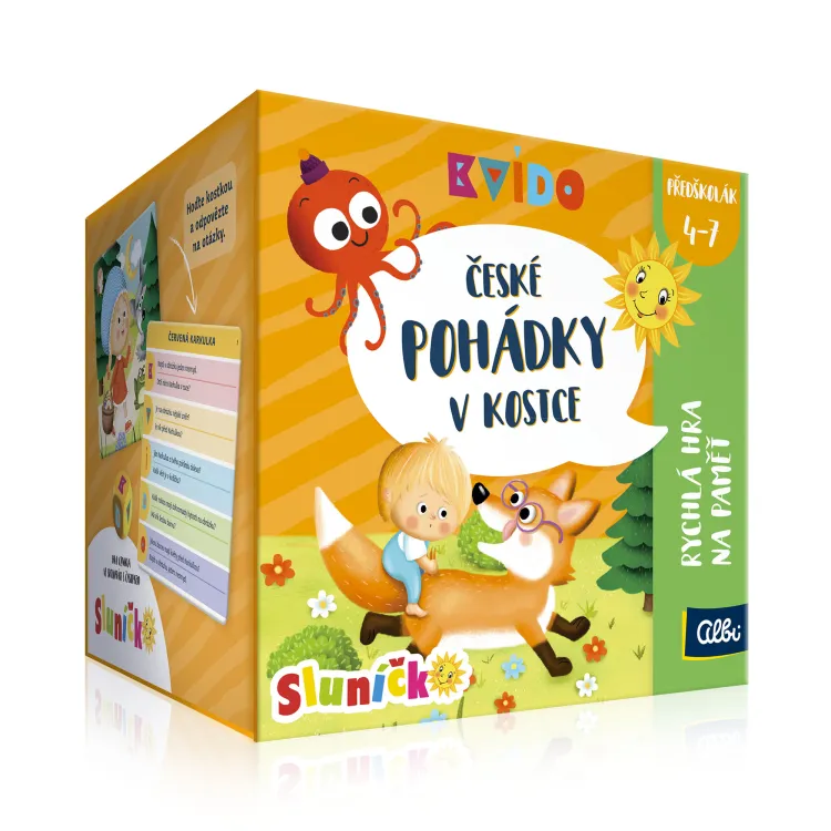 Hra „České pohádky v kostce“ od Albi kombinuje klasické české příběhy s napínavou hrou na paměť. Děti mají 15 sekund na zapamatování obrázkové karty a následně odpovídají na otázky — zábavná výzva pro celou rodinu. Bonusové kolo „Kvídova paměťovka“ přináší další vzrušující moment, když kostka ukáže symbol Kvída. Kompaktní balení a krátká doba hraní ji činí ideální pro domov i cesty. Perfektní volba pro malé i větší děti, které milují pohádky a hru s přiměřenou výzvou.