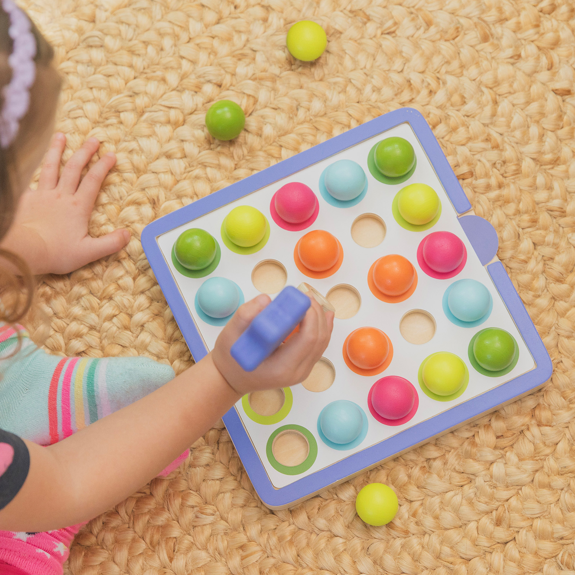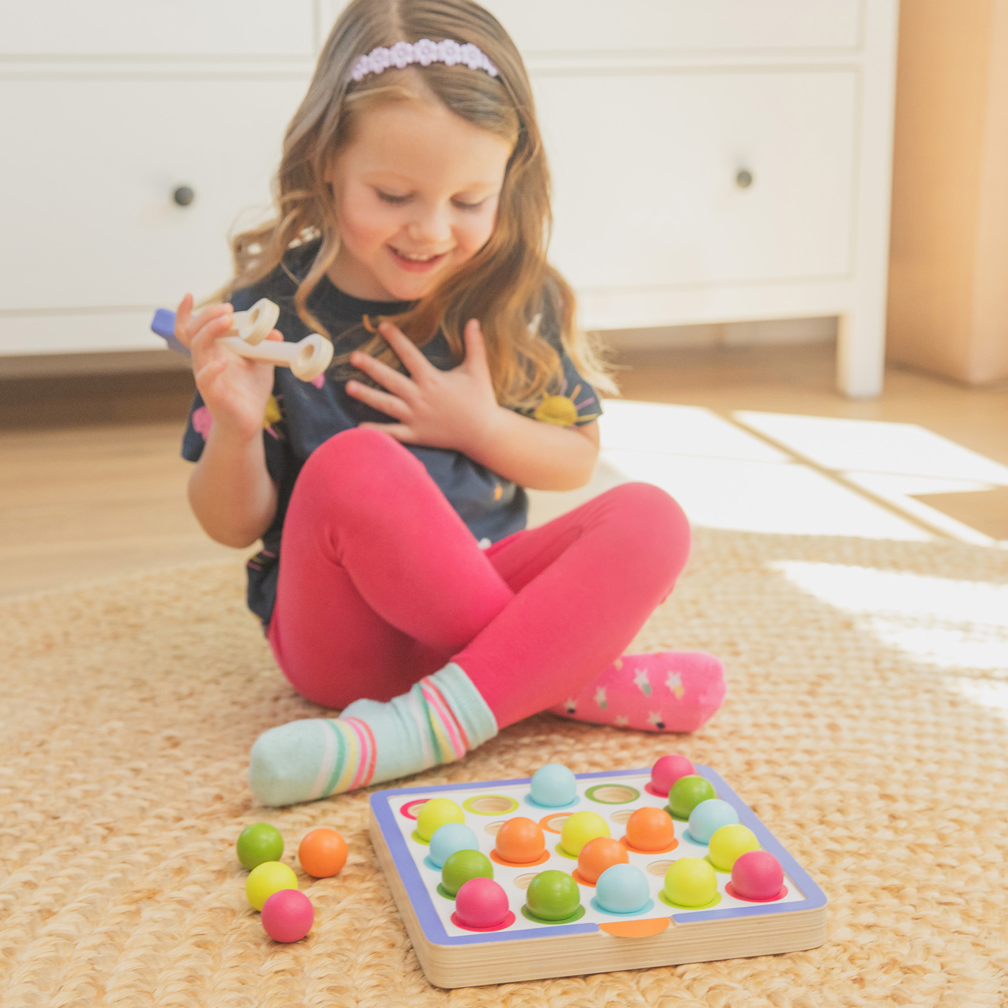 Děti od 3 let si při hře s touto montessori sadou rozvíjejí dovednosti v oblasti porovnávání, vytváření vzorů, sekvencí a jemné motoriky.