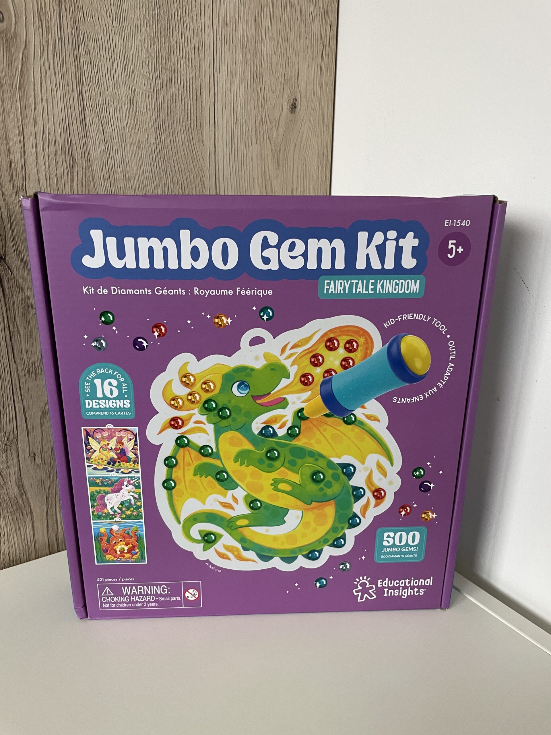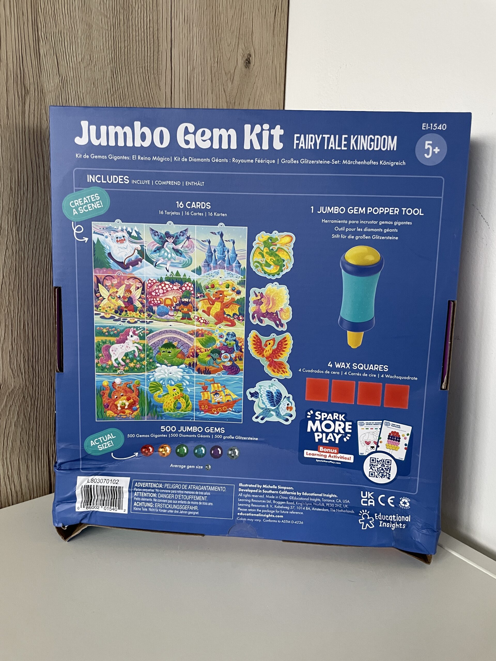 Malé děti si mohou užít oblíbenou kratochvíli malování pomocí diamantů s Jumbo Gem Kit: Pohádkové království. S 500 barevnými velkými drahokamy, 16 opakovaně použitelnými designovými kartami, které lze poskládat dohromady a vytvořit tak zábavnou scénu, a „drahokamovým“ nástrojem mohou děti vyjádřit svou kreativitu a zároveň budovat základní jemné motoriky.
