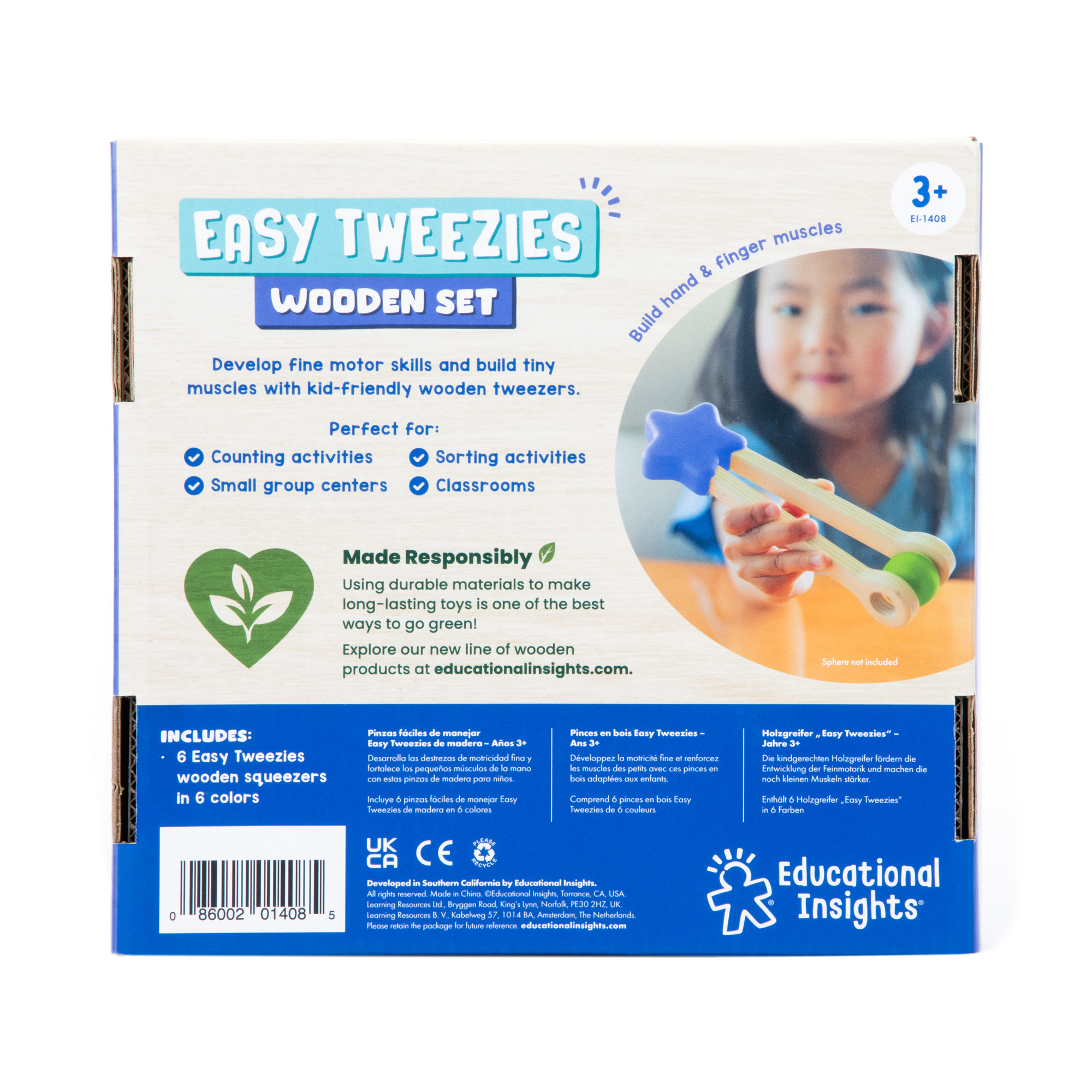 Děti od 3 let si při každém použití našich dřevěných pinzet Easy Tweezies posilují ruce, zlepšují obratnost a koordinaci. Při zvedání, třídění a přemísťování různých předmětů se učí zábavnou a praktickou formou.