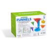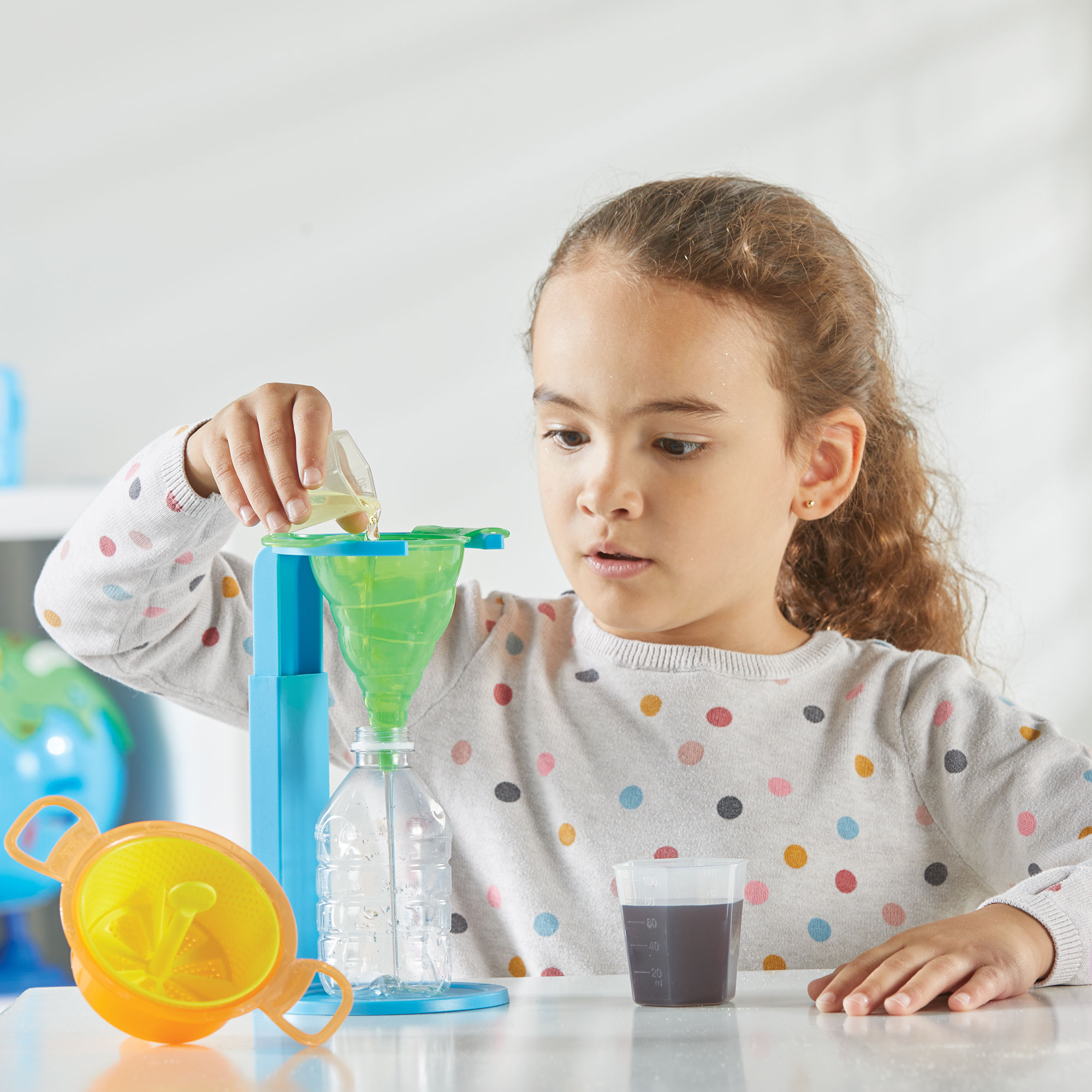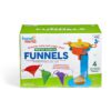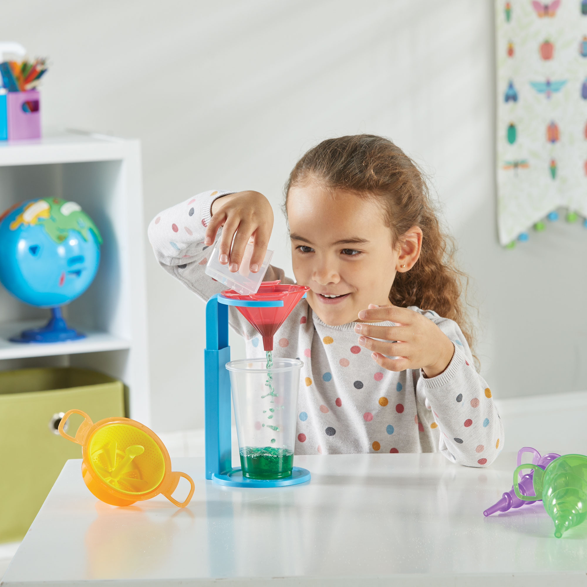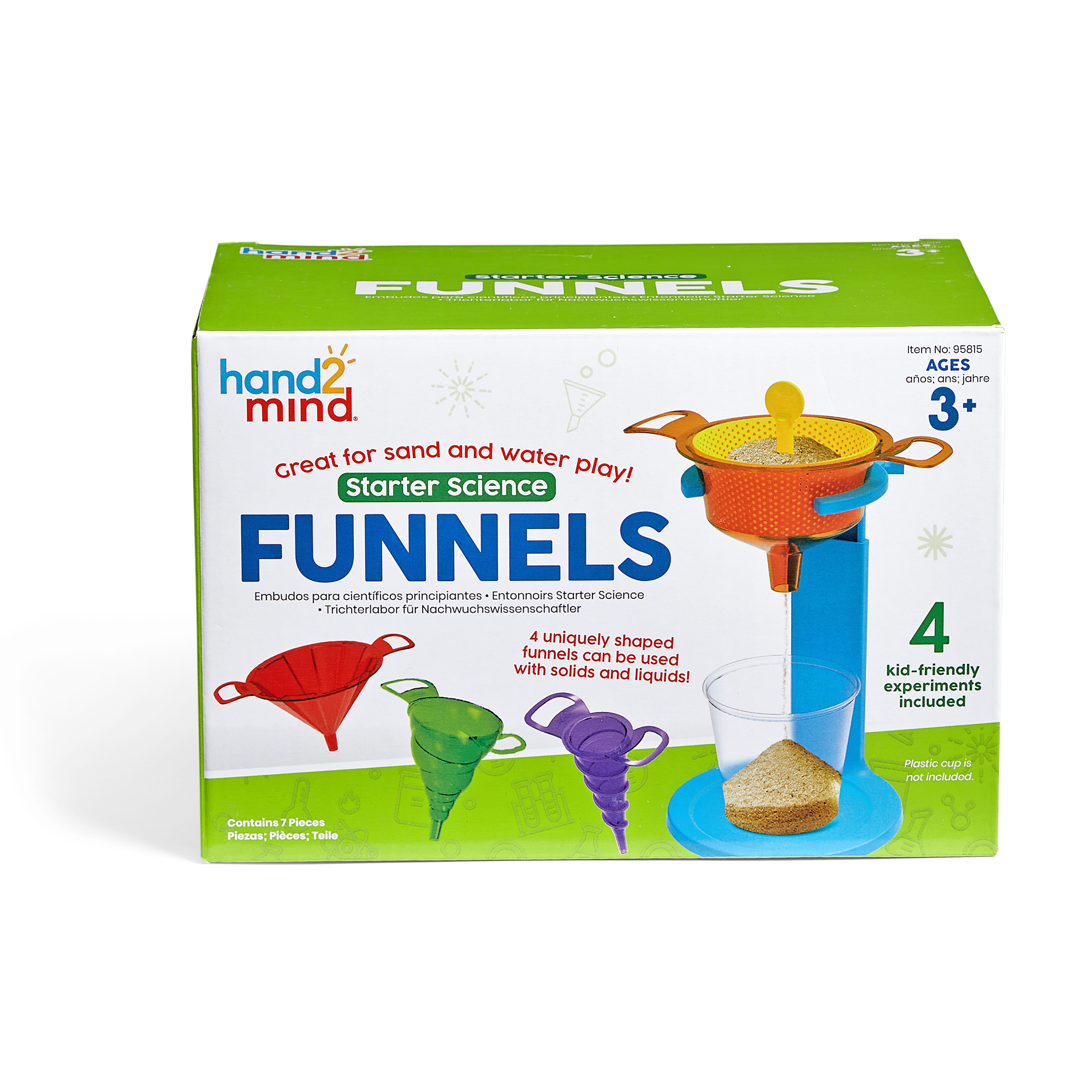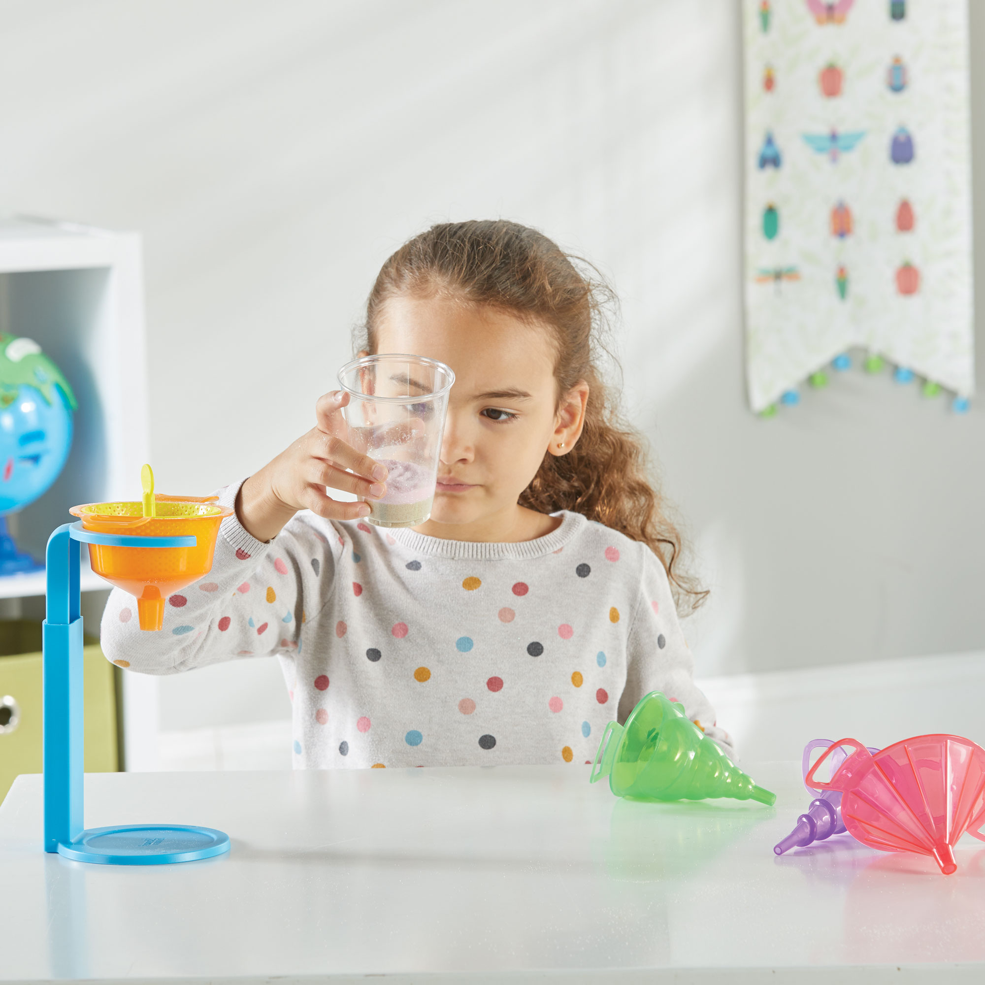 Tyto nálevky jsou kompatibilní s pevnými látkami i kapalinami a umožňují dětem zkoumat průtoky, objem, prosévání a další. Nastavitelný stojan se hodí na nádoby různých velikostí a pro malé vědce drží nálevky stabilně.