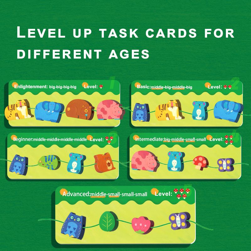 - 12 dřevěných dílků zobrazujících les a zvířátka, každý s otvorem pro navlékání. Celkem mají dílky 3 velikosti otvorů.