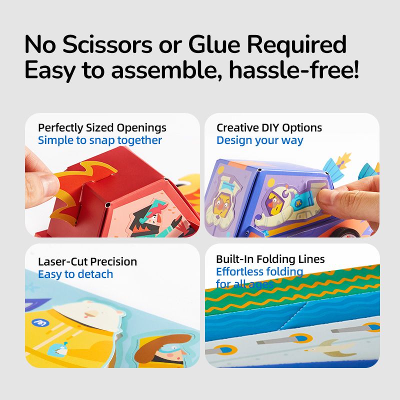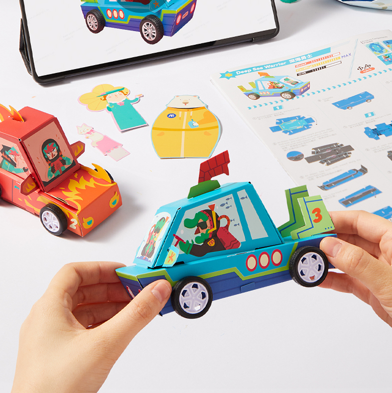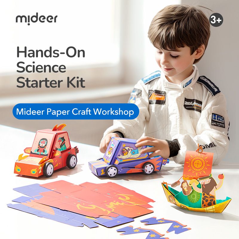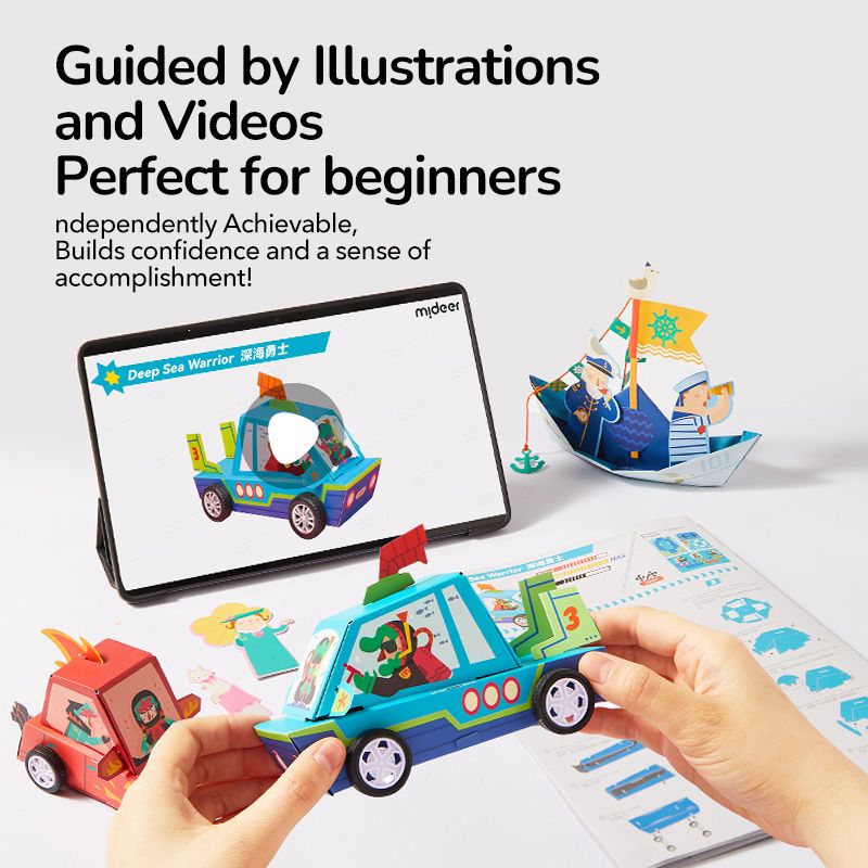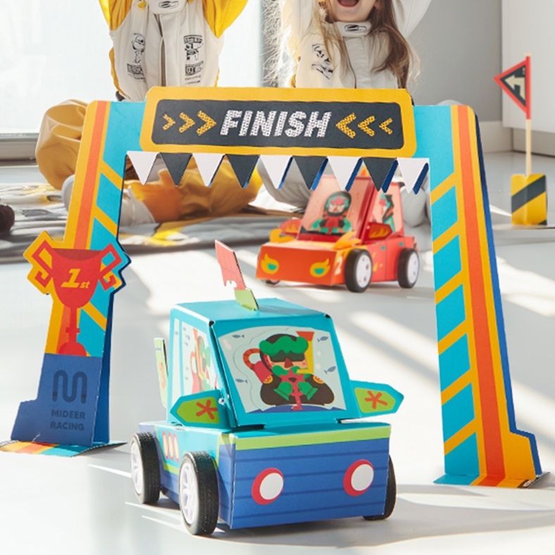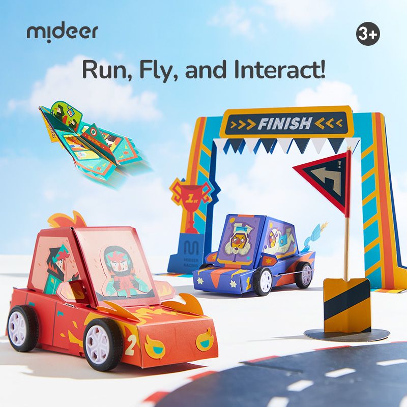 Připravte se na dobrodružství v závodním světě s touto kreativní sadou od MiDeer! Děti si složí tři pestrobarevná papírová závodní autíčka, která pak mohou skutečně využít k hře. Každý model je oživen praktickými detaily: