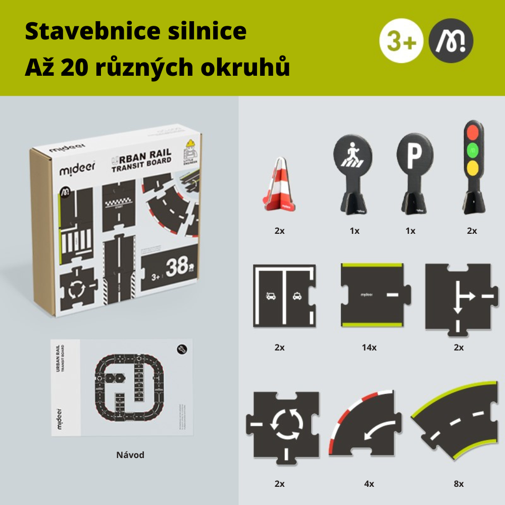 - 38 barevných dílků s motivy silnice pro nekonečné variace tras – od jednoduchých kroužků až po propracované závodní okruhy.
