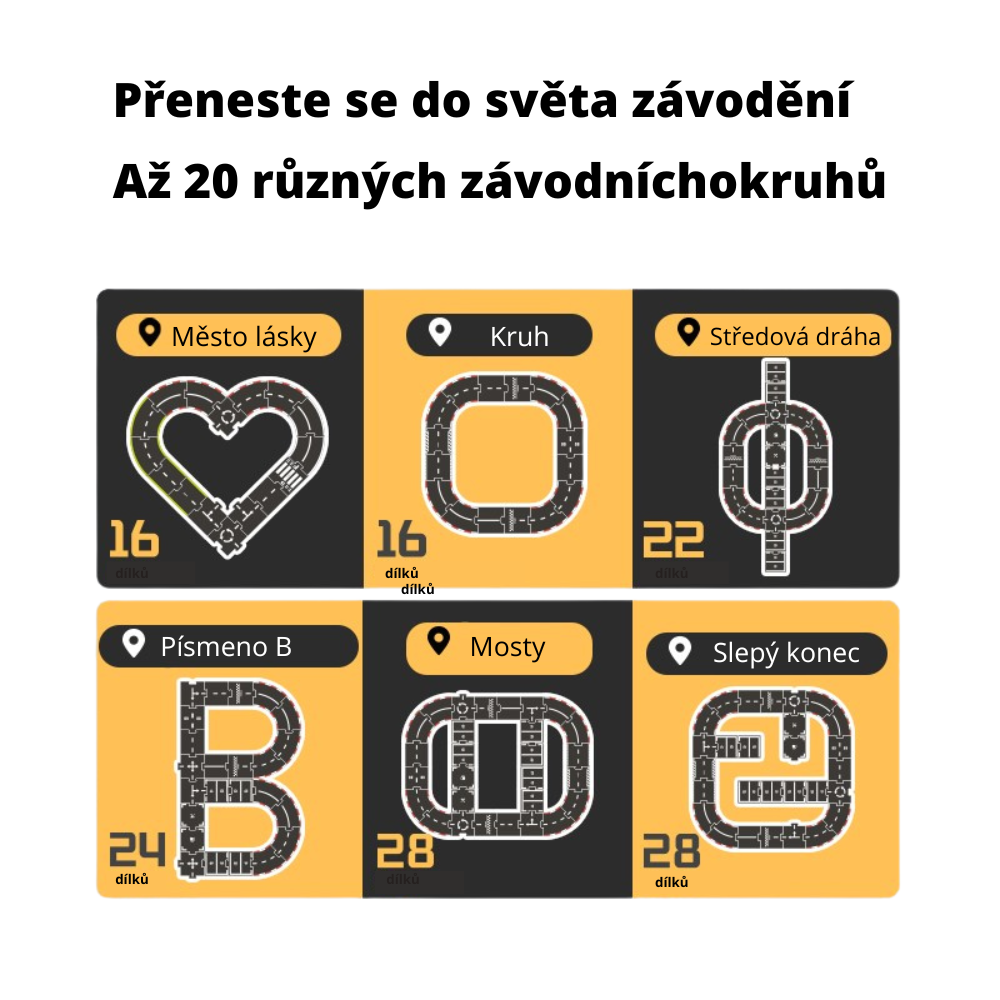 Oživte pokoj závodní atmosférou – s touto inovativní stavebnicí z kvalitního kartonu děti během pár minut vytvoří hravý závodní okruh. Díky variabilním dílkům s přechody, kruhovými objezdy a směrovými šipkami si mohou navrhovat tratě podle vlastní fantazie nebo inspirováni přiloženým návodem.