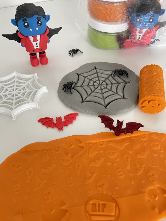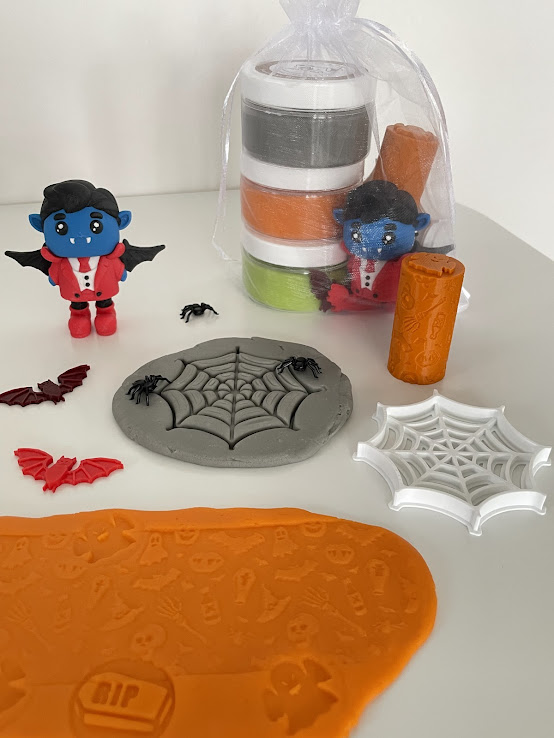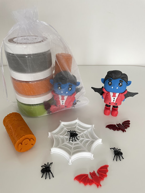 Model upíra, razítko, váleček a doplňky jsou vyrobeny z ekologicky odbouratelného, BIO materiálu PLA (biologicky plně odbouratelný materiál, vyráběný z kukuřičného nebo bramborového škrobu či z cukrové třtiny).