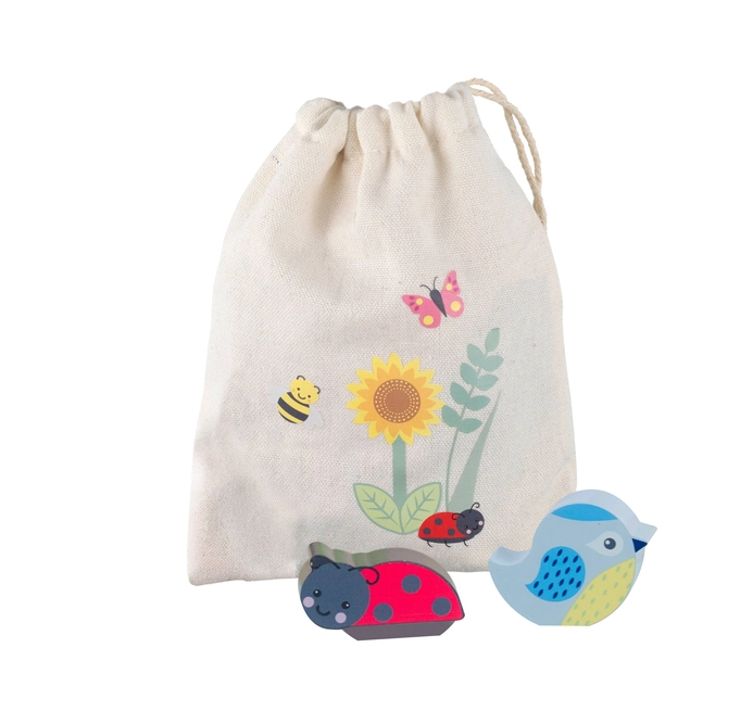 Krásná dřevěná sada s motivy jarní zahrady plná barevných květin, motýlů, ptáčků a dalších veselých tvarů, kterou si děti mohou sázet, skládat a stavět do různých tvarů. Díly mohou vrstvit, řadit podle velikosti nebo používat jako součást volné imaginativní hry – například jako krásnou scénu jarní louky plnou života. Sada podporuje více způsobů hry a je vhodná i pro menší děti, které se učí objevovat tvary a rozvíjet své motorické dovednosti.