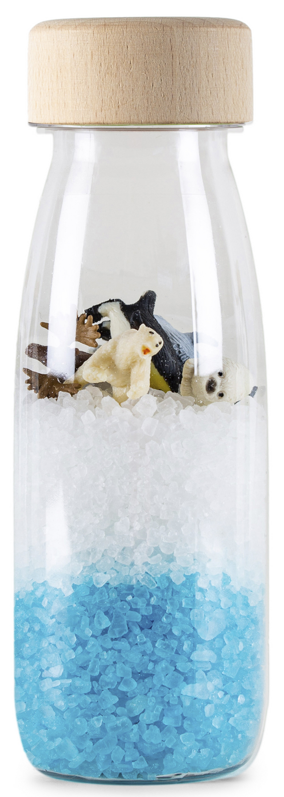 Objevte kouzlo zimní krajiny uzavřené v lahvi! Dítě může lahvičku otáčet, třást s ní a pozorovat, jak se ve světle odhalují chladivé odstíny bílé a modré – a jak mezi „ledovými krystaly“ vykukují polární zvířátka. Najdete zatoulaného tučňáka? Pozorovací lahve Petit Boum baví, vzdělávají a přitom pomáhají dětem zklidnit se a soustředit.