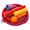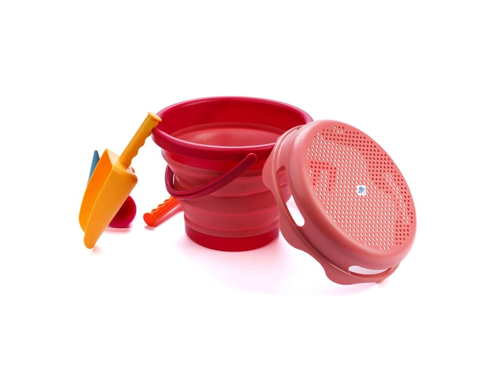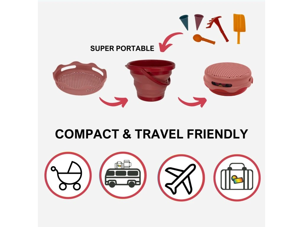 Díky kompaktním rozměrům (průměr: 22 cm, výška: 8,6 cm) je sada ideální pro cestování, kempování nebo hru na pláži. Vejde se snadno do tašky, kufru nebo kočárku, což z ní činí perfektního společníka na dovolenou. Kvalitní biologicky nezávadné materiály zajišťují dlouhou životnost a šetrnost k životnímu prostředí. Patentovaný design zaručuje odolnost a je navržen tak, aby ho mohly používat děti po několik generací.