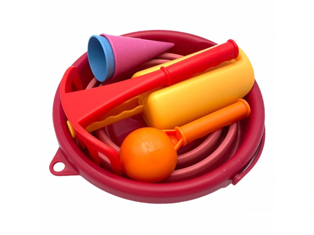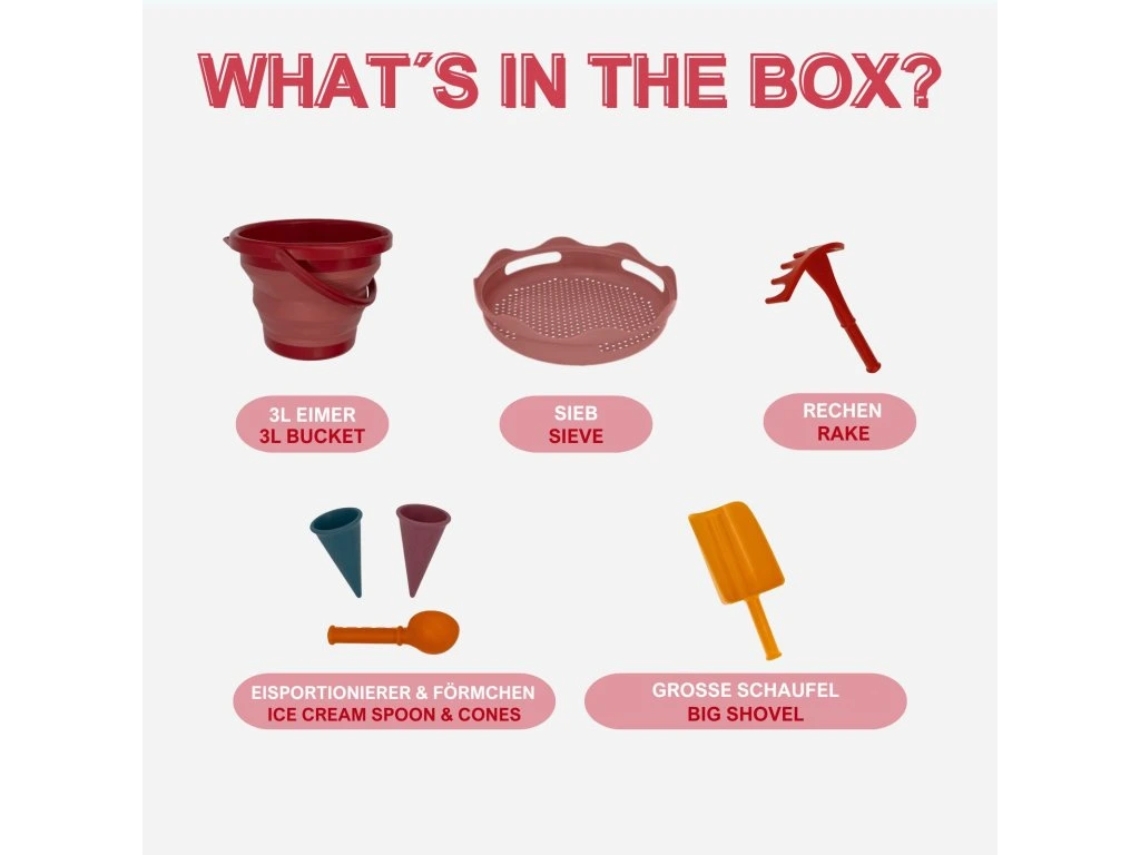 • Obsah balení: třílitrový skládací kyblík, naběračka na zmrzlinu, sítko, velká lžíce, hrabičky, dvě bábovky ve tvaru kornoutů.