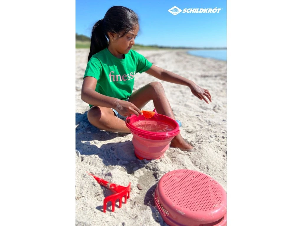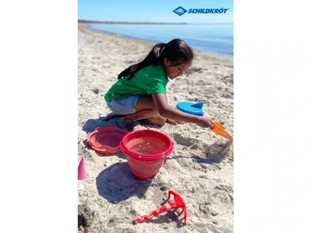 Praktická sada na písek od značky Schildkröt potěší všechny děti, které milují tvoření na pískovišti i na pláži. Hlavní předností je skládací kyblík, který nezabere téměř žádné místo – ideální na cestování i ukládání doma.