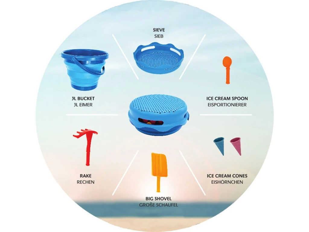 • Obsah balení: třílitrový skládací kyblík, naběračka na zmrzlinu, sítko, velká lžíce, hrabičky, dvě bábovky ve tvaru kornoutů.