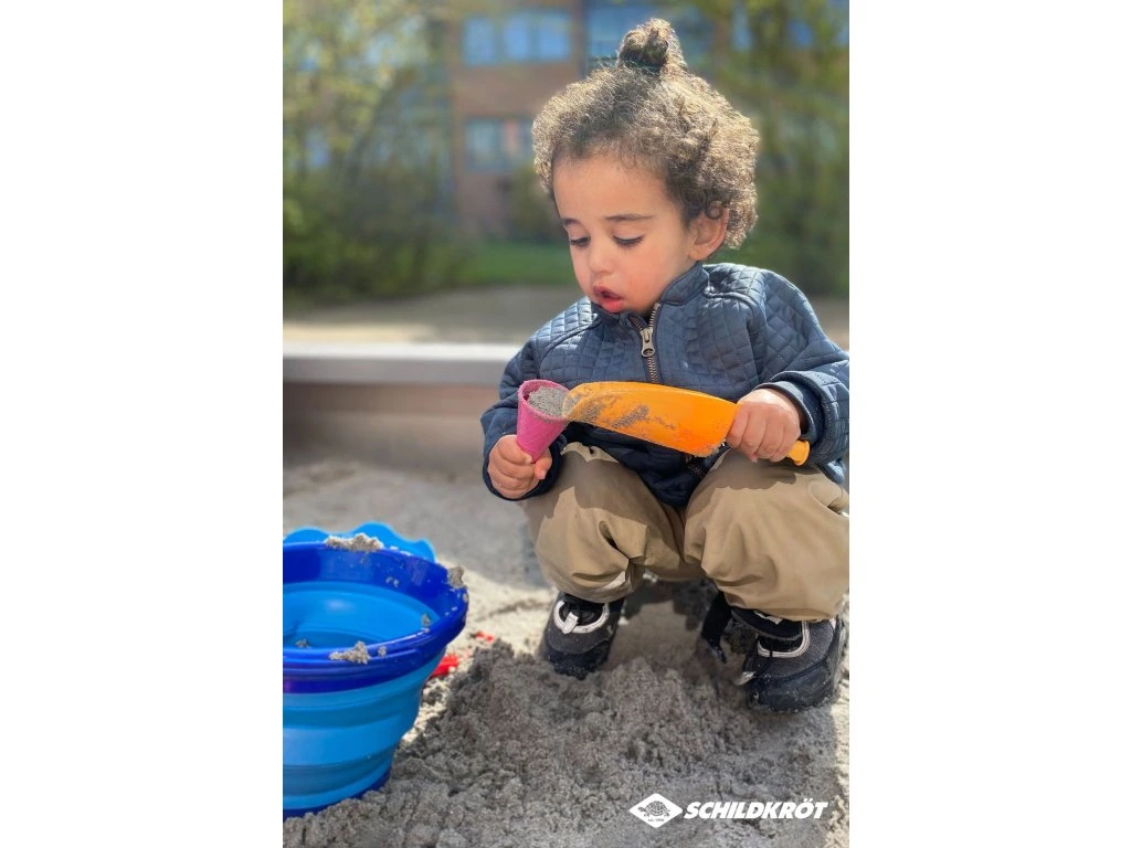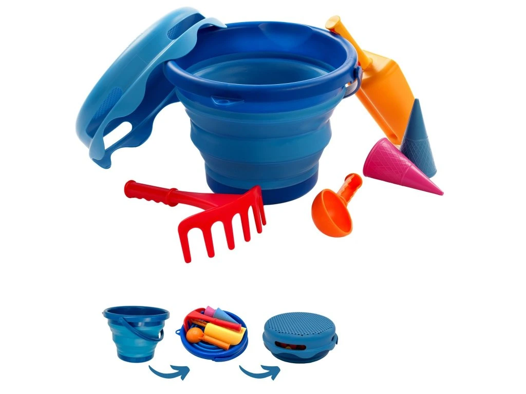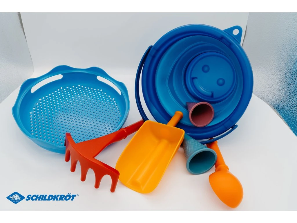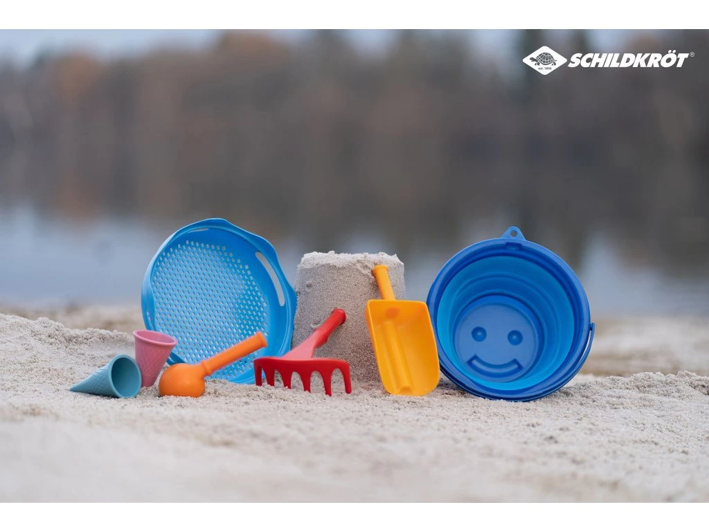 Praktická sada na písek od značky Schildkröt potěší všechny děti, které milují tvoření na pískovišti i na pláži. Hlavní předností je skládací kyblík, který nezabere téměř žádné místo – ideální na cestování i ukládání doma.