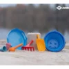 Díky kompaktním rozměrům (průměr: 22 cm, výška: 8,6 cm) je sada ideální pro cestování, kempování nebo hru na pláži. Vejde se snadno do tašky, kufru nebo kočárku, což z ní činí perfektního společníka na dovolenou. Kvalitní biologicky nezávadné materiály zajišťují dlouhou životnost a šetrnost k životnímu prostředí. Patentovaný design zaručuje odolnost a je navržen tak, aby ho mohly používat děti po několik generací.